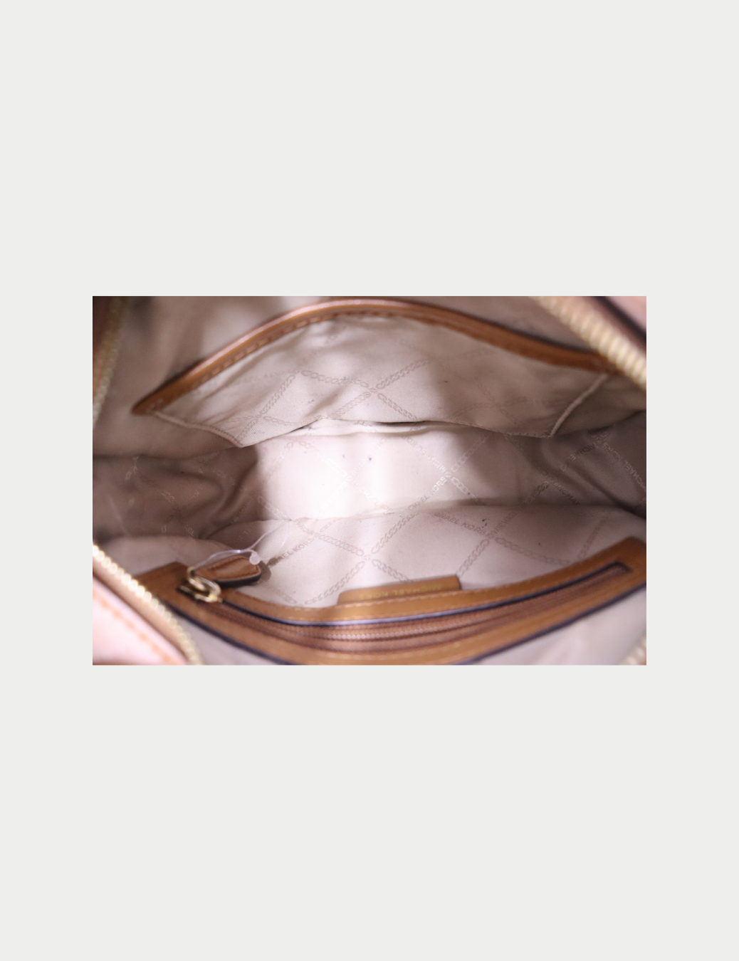 A classic you’ll never get bored of — this Michael Kors Signature crossbody bag is crafted in the brand’s iconic MK monogram canvas with warm tan leather trim, finished with polished gold-tone hardware, a chic chain strap accent, and a statement tassel charm.