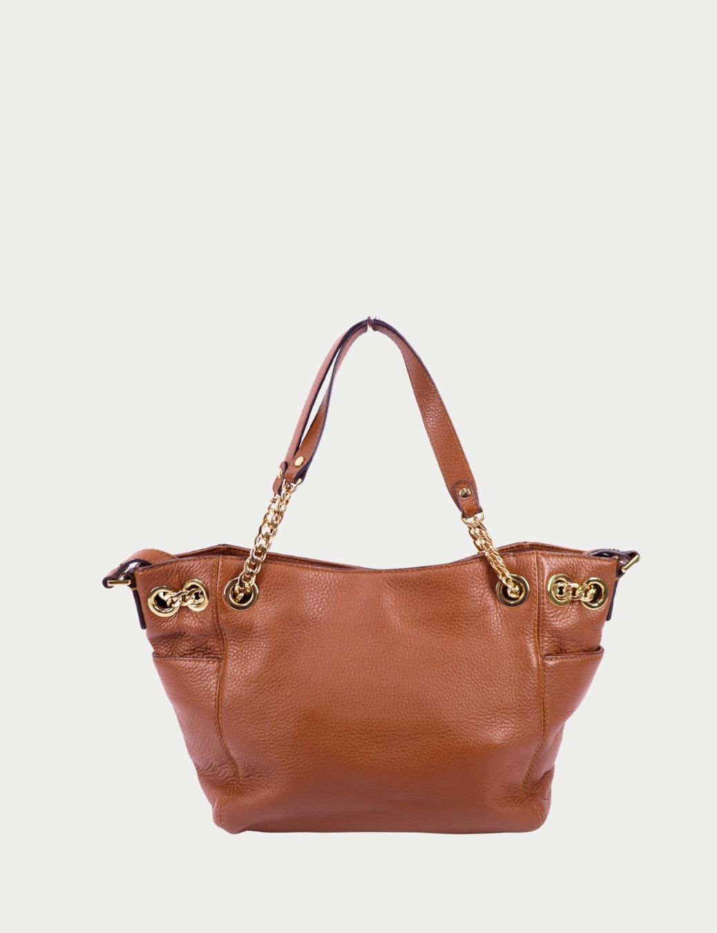 This elegant Michael Kors shoulder bag features premium pebbled leather in a warm brown shade, complemented by gold-tone hardware and signature chain strap details. The relaxed yet structured silhouette offers both style and comfort, making it ideal for daily wear, work, or travel.