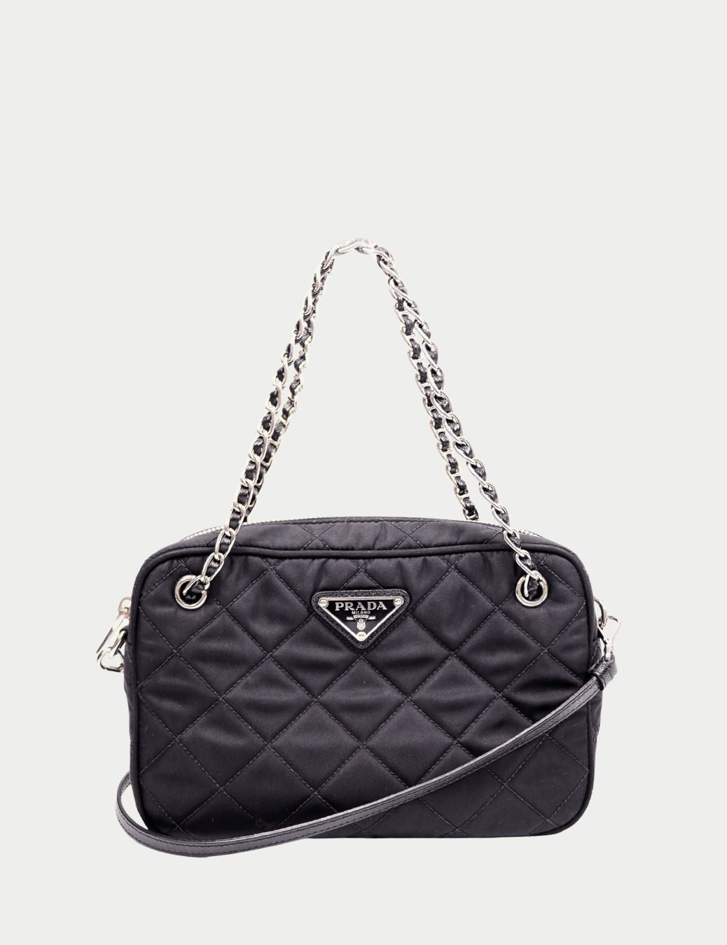 This Prada Quilted Nylon Chain Shoulder Bag is a refined essential that blends practicality with iconic Italian design. Crafted from Prada’s signature quilted nylon, the bag features the instantly recognizable Prada triangle logo plaque, polished silver-tone chain straps, and a detachable leather shoulder strap for versatile styling.