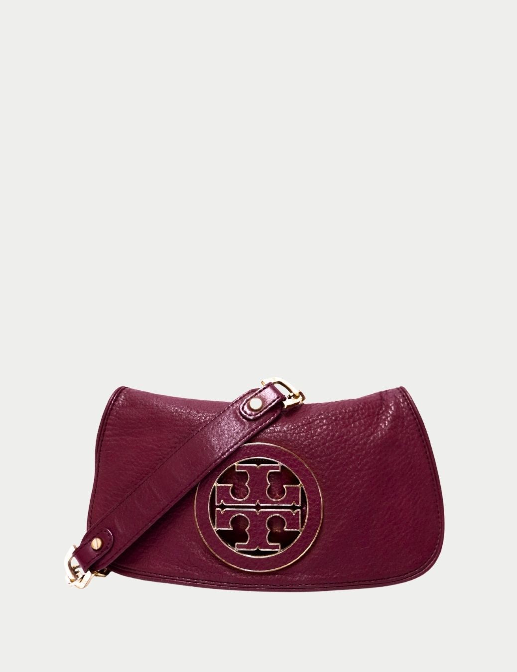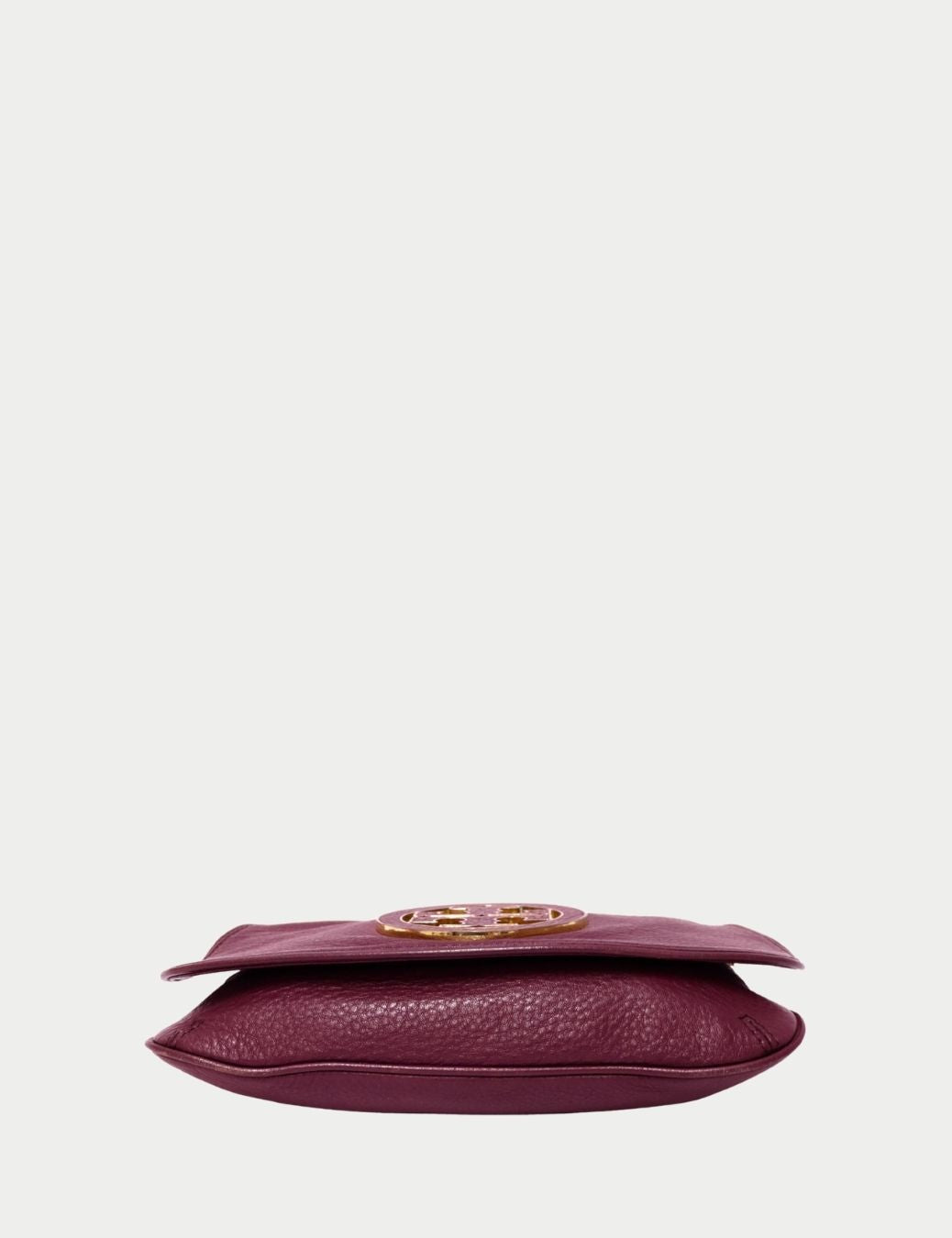 Elegant, timeless, and instantly recognizable — this Tory Burch crossbody bag is crafted from rich burgundy pebbled leather and finished with the brand’s iconic oversized gold logo medallion on the front.