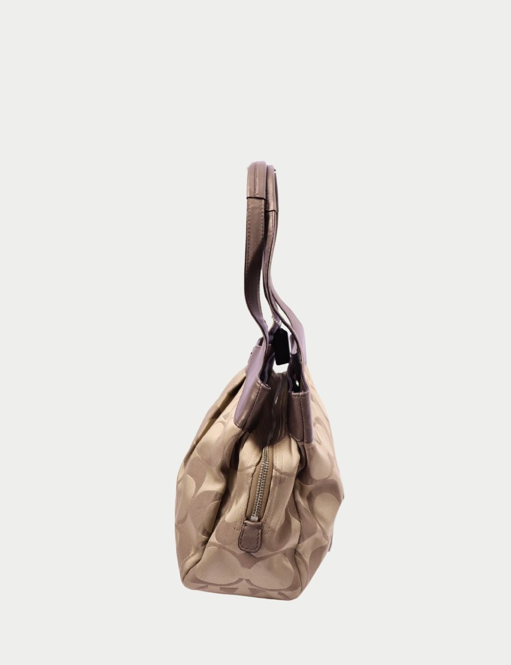 This authentic Coach shoulder bag is crafted from the brand’s iconic signature canvas, complemented by durable leather trim and structured shoulder straps. Designed with a spacious interior and a comfortable silhouette, it’s perfect for daily use while maintaining a polished, designer aesthetic.