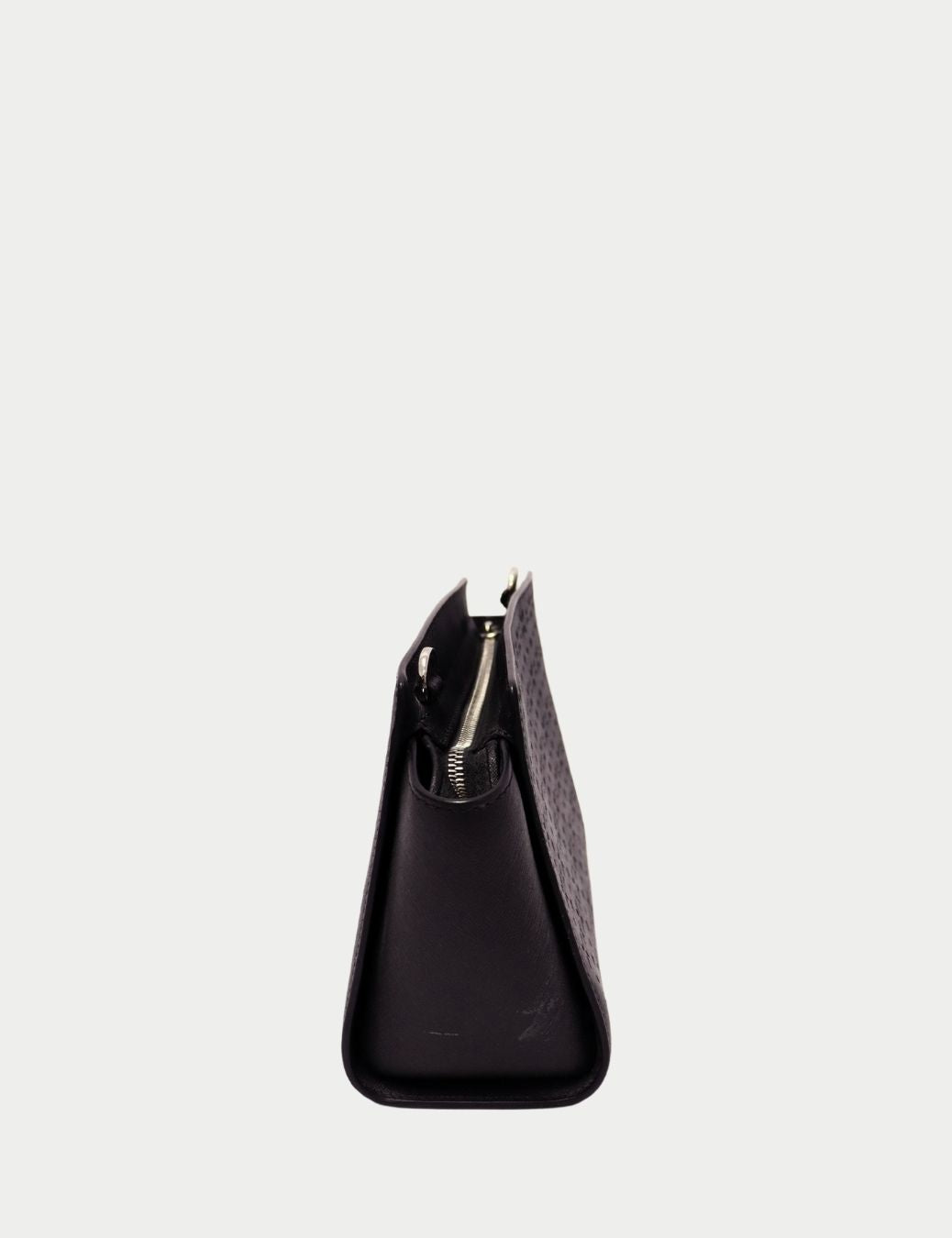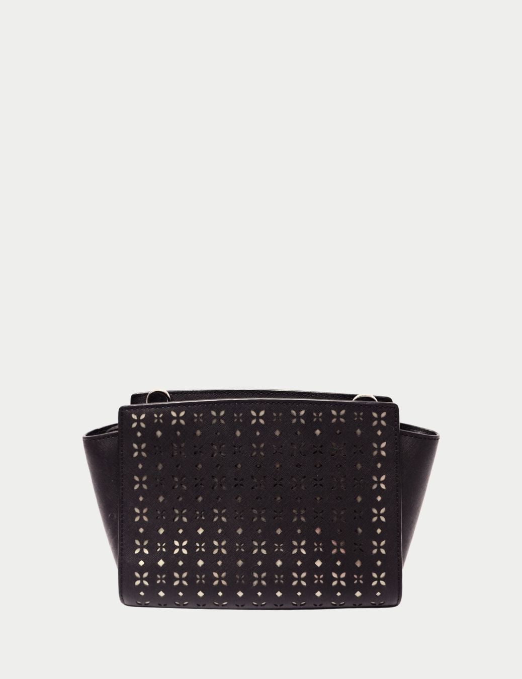 • Features: Laser-cut pattern detailing, structured silhouette, top zip closure, adjustable strap