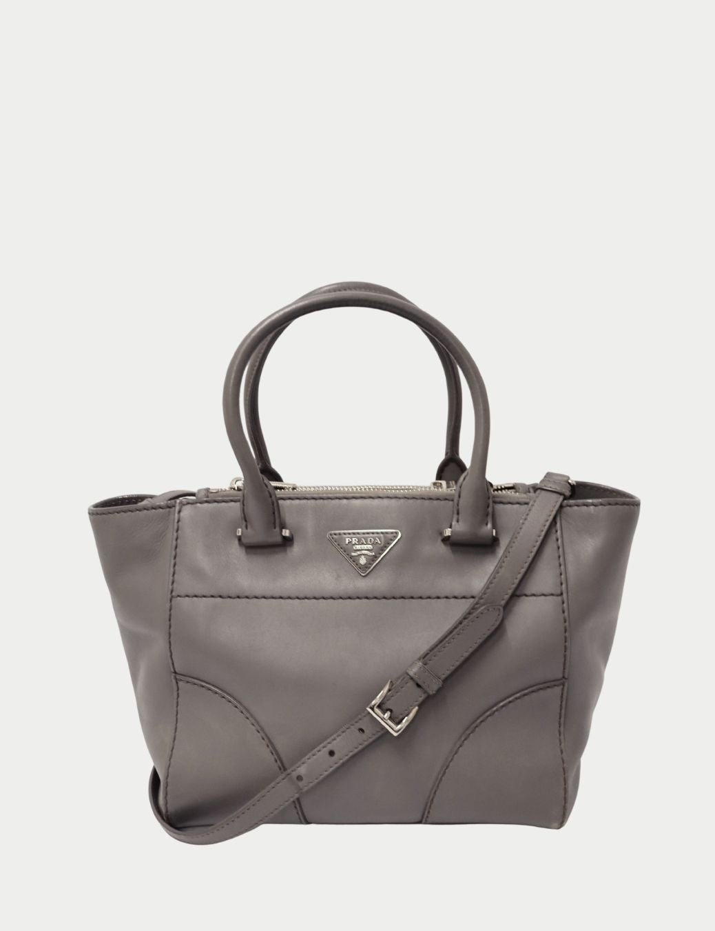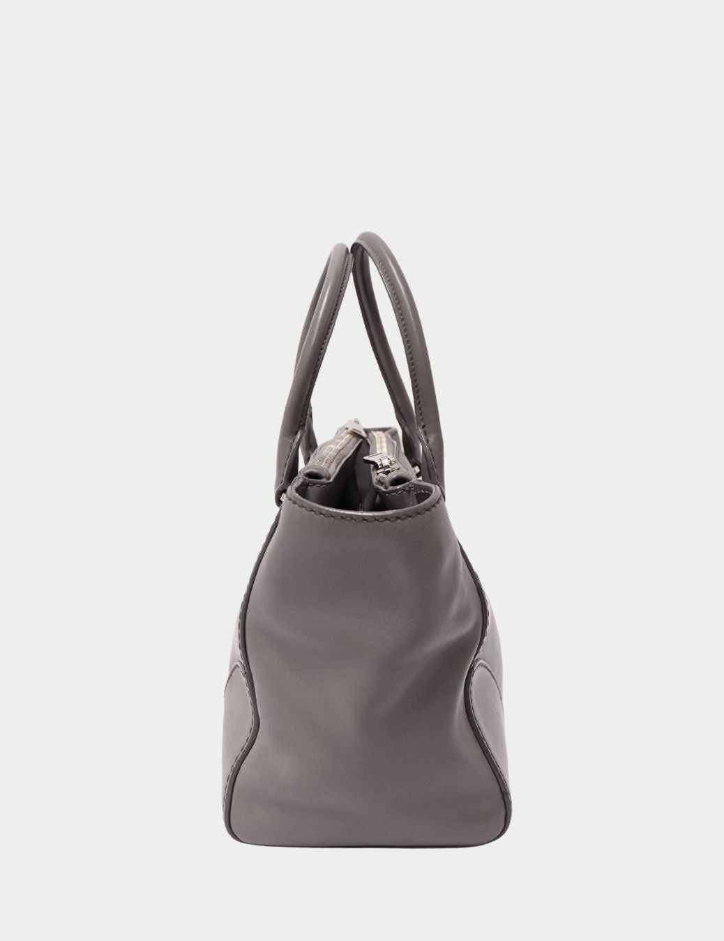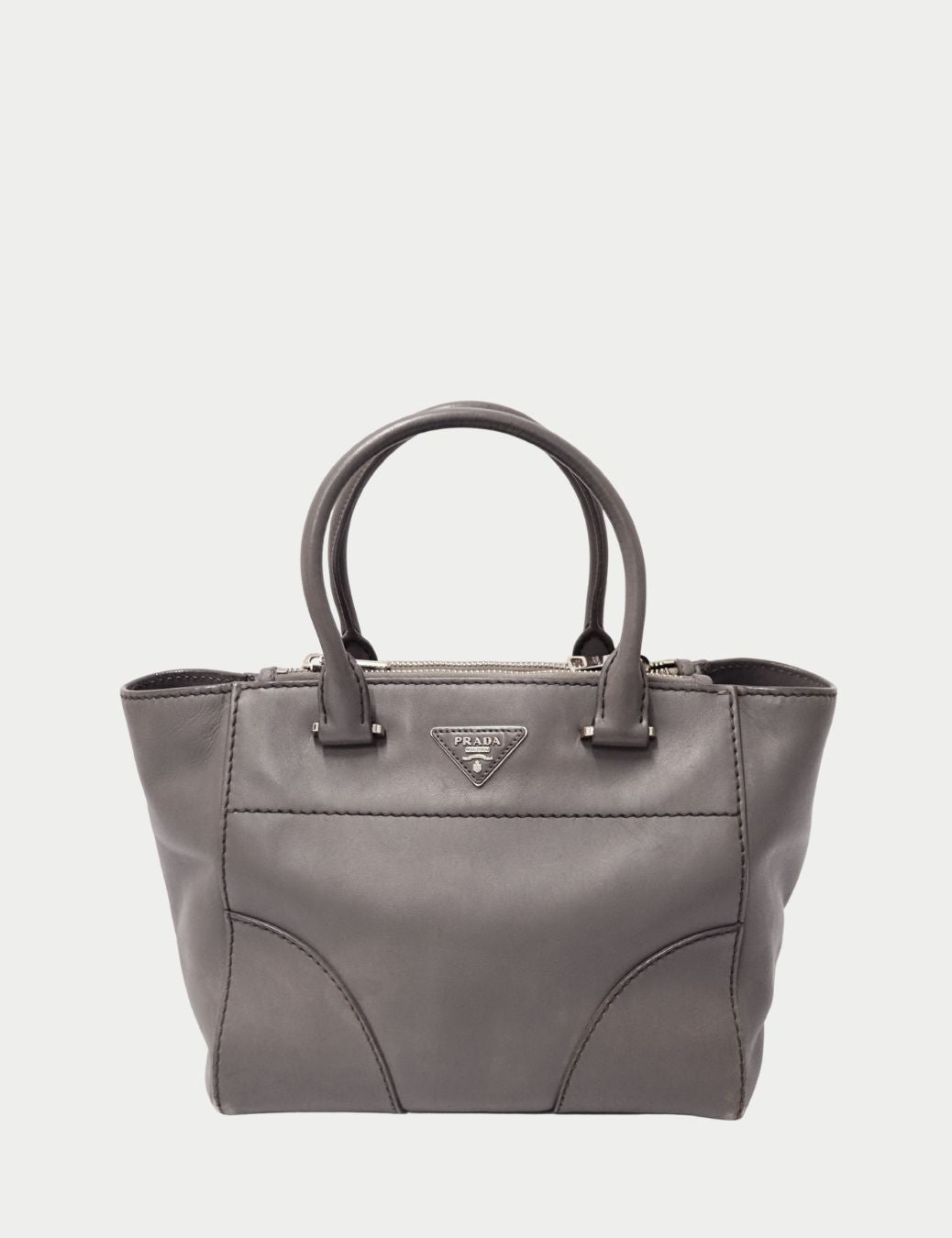 Prada Grey Leather Handbag with Top Handles and Silver Logo Plaque