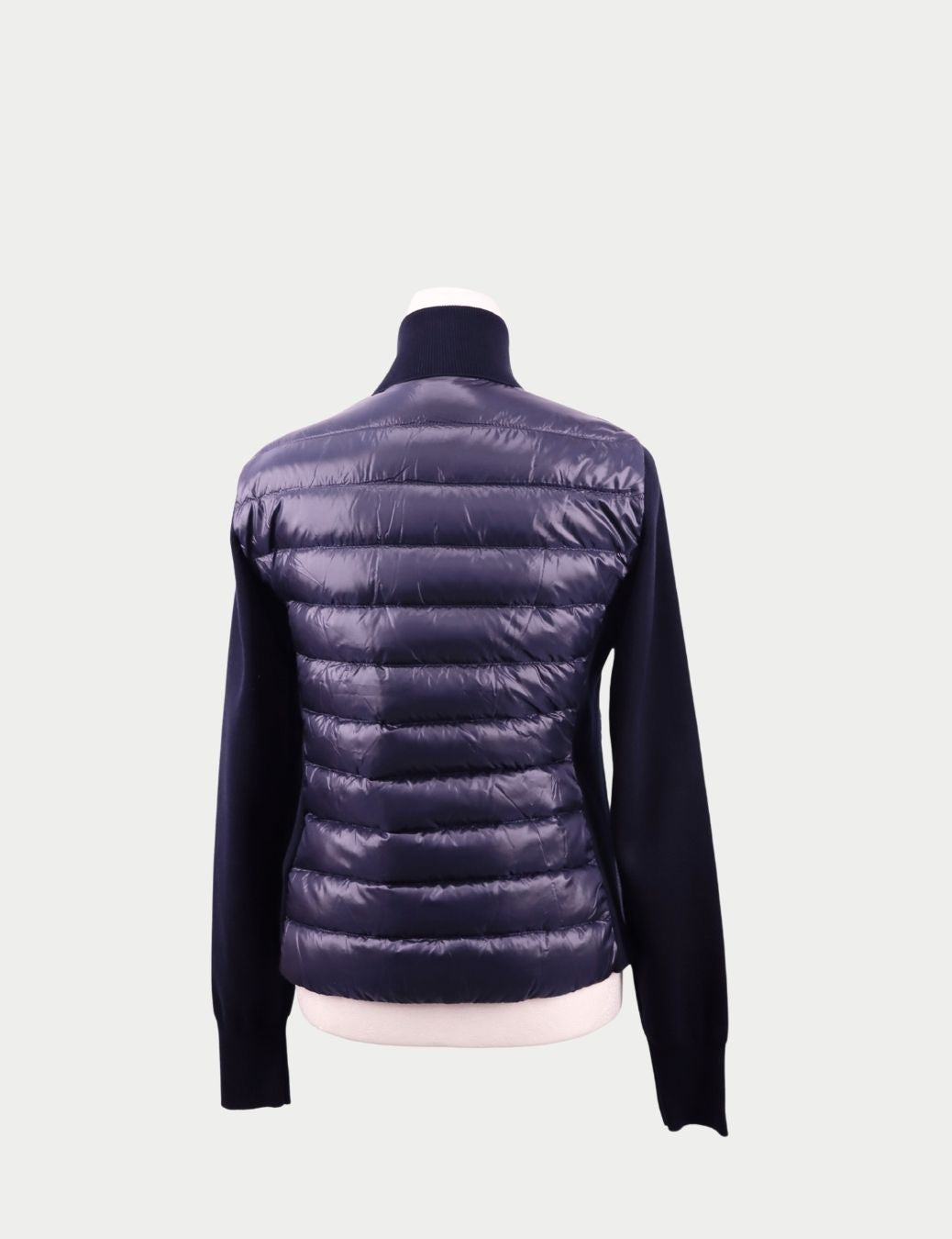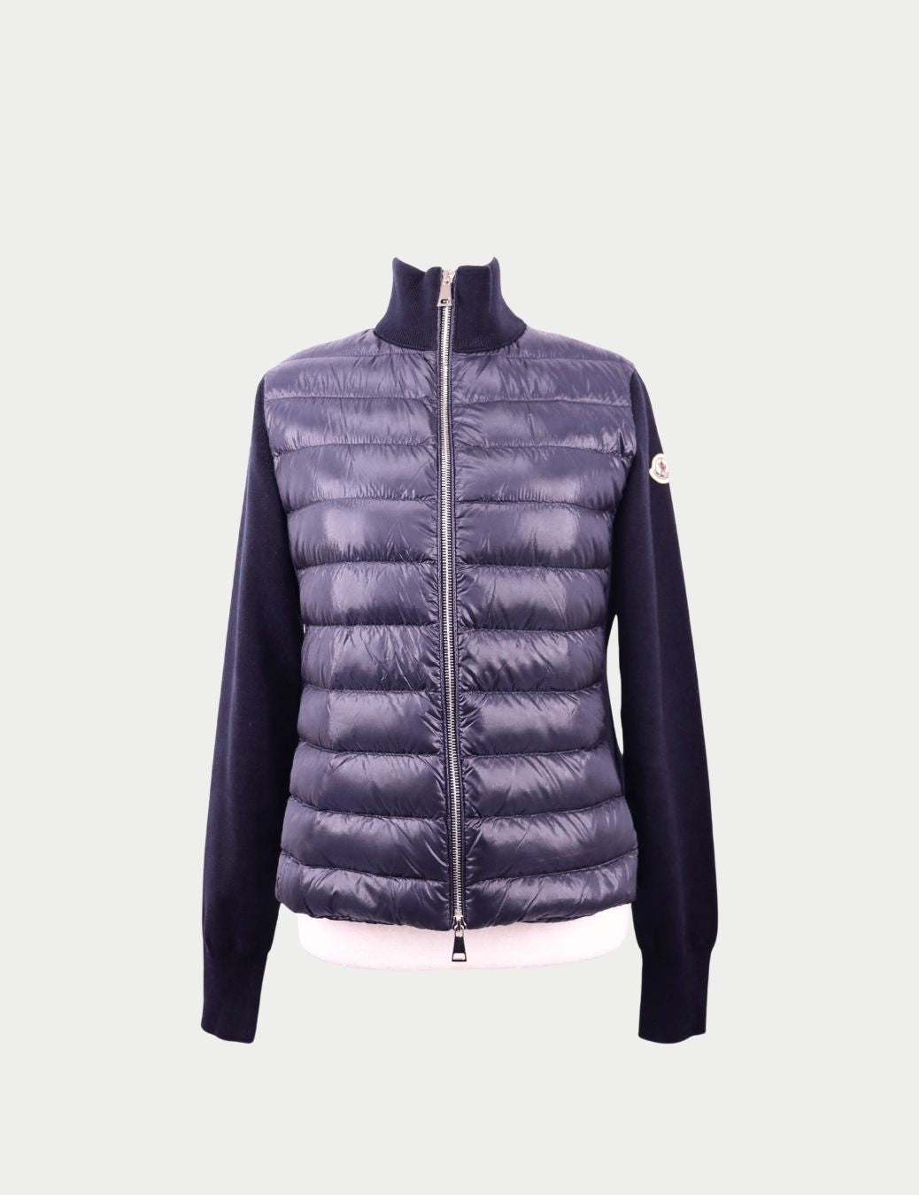 Stay warm in style with this Moncler navy hybrid puffer jacket, designed with a quilted down-filled front panel and soft knit sleeves for the perfect balance of comfort and performance.