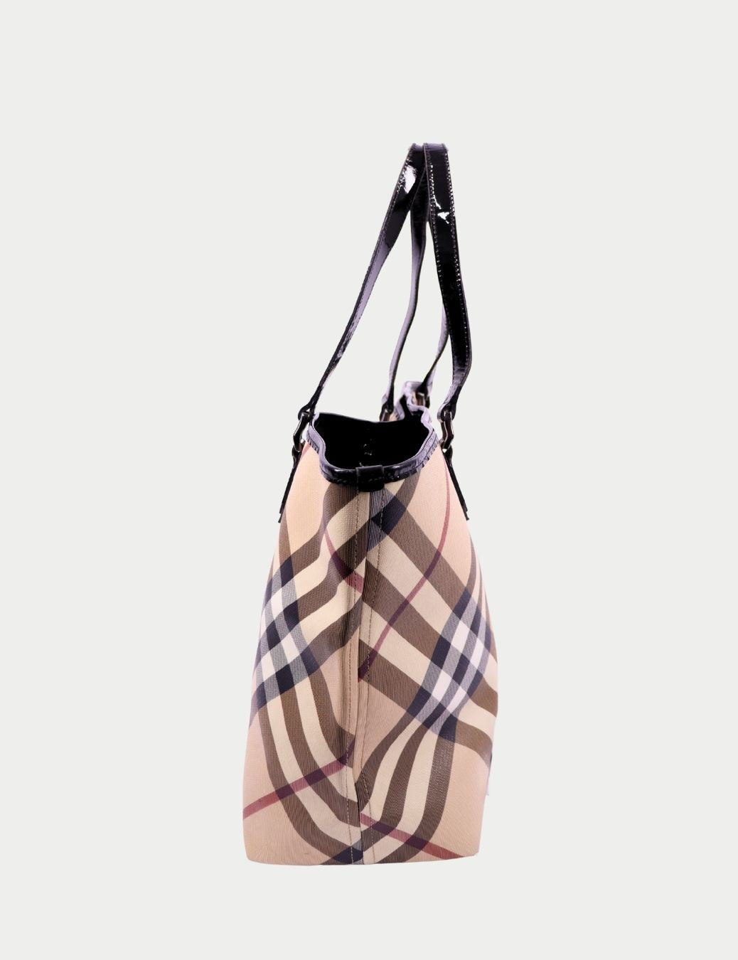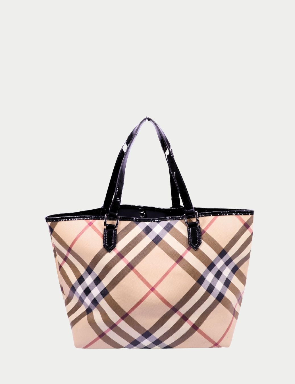 A forever classic that never goes out of style—this Burberry Supernova Check tote bag features the brand’s instantly recognizable check pattern paired with glossy black patent leather handles and trim for a polished finish.