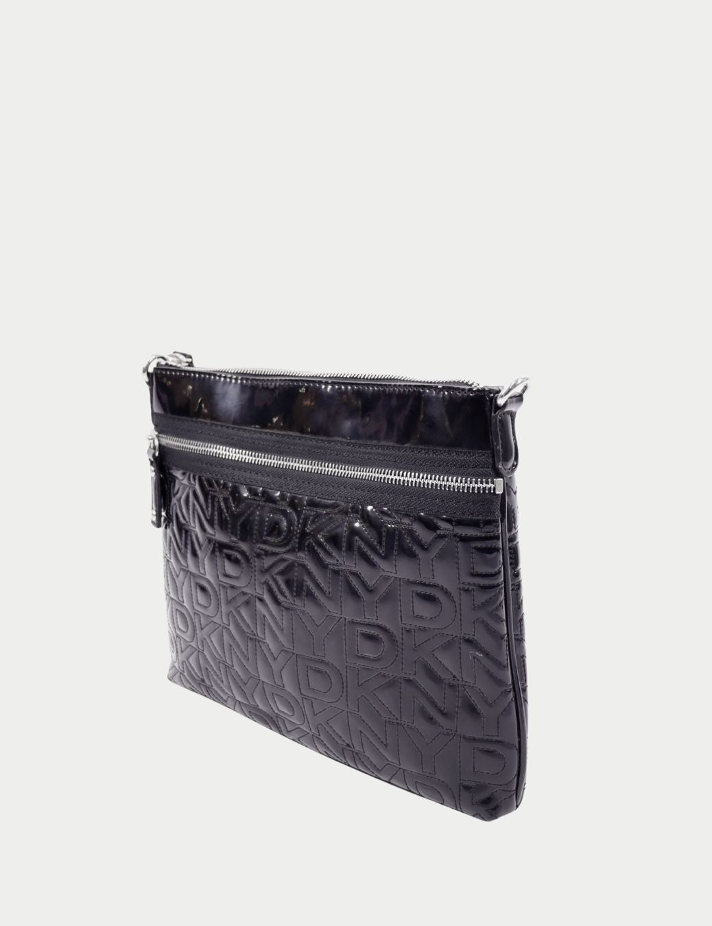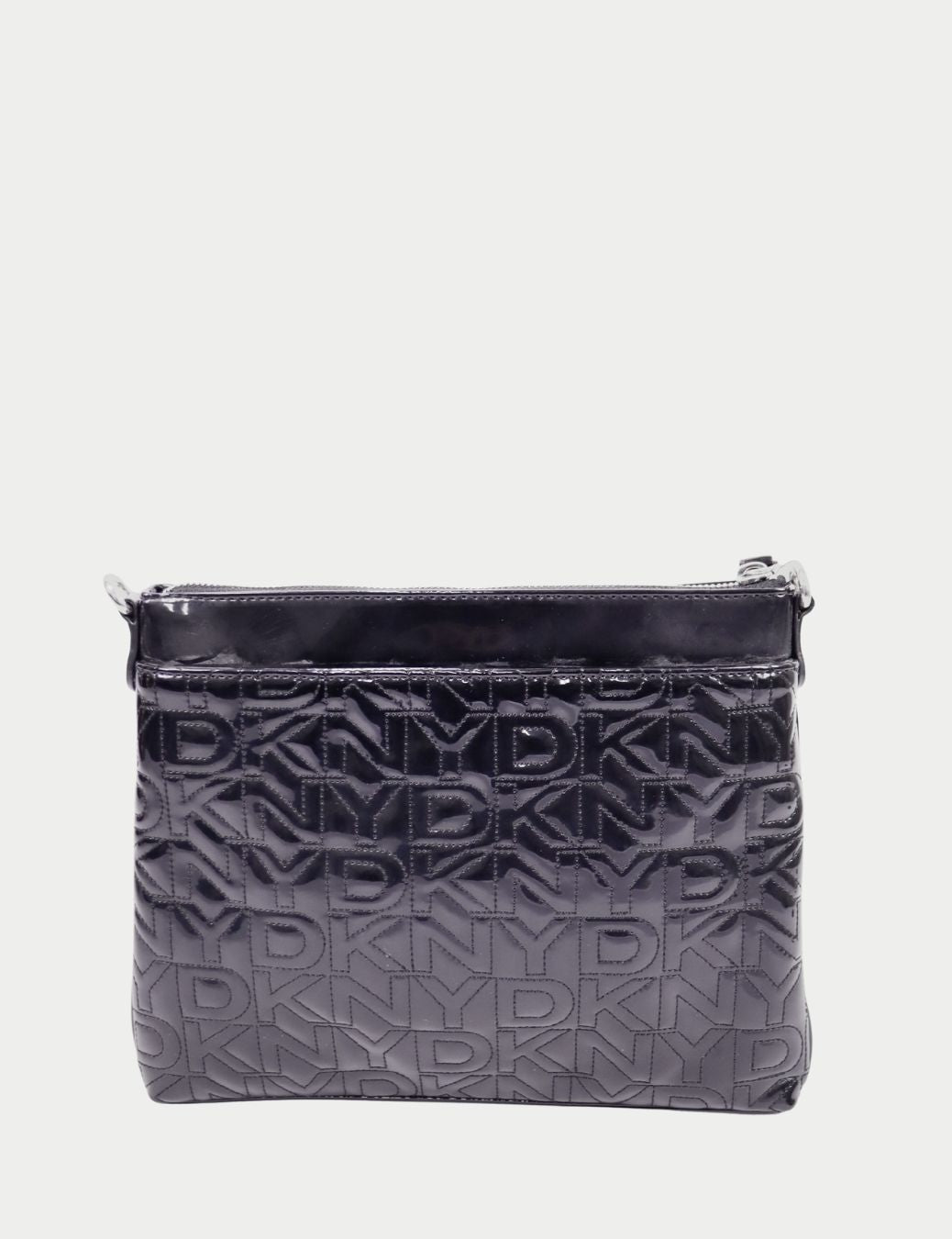 Keep it sleek, practical, and effortlessly chic with this DKNY black patent crossbody bag. Designed in glossy patent material with an all-over embossed DKNY logo pattern, this piece is lightweight, stylish, and perfect for day-to-day wear.