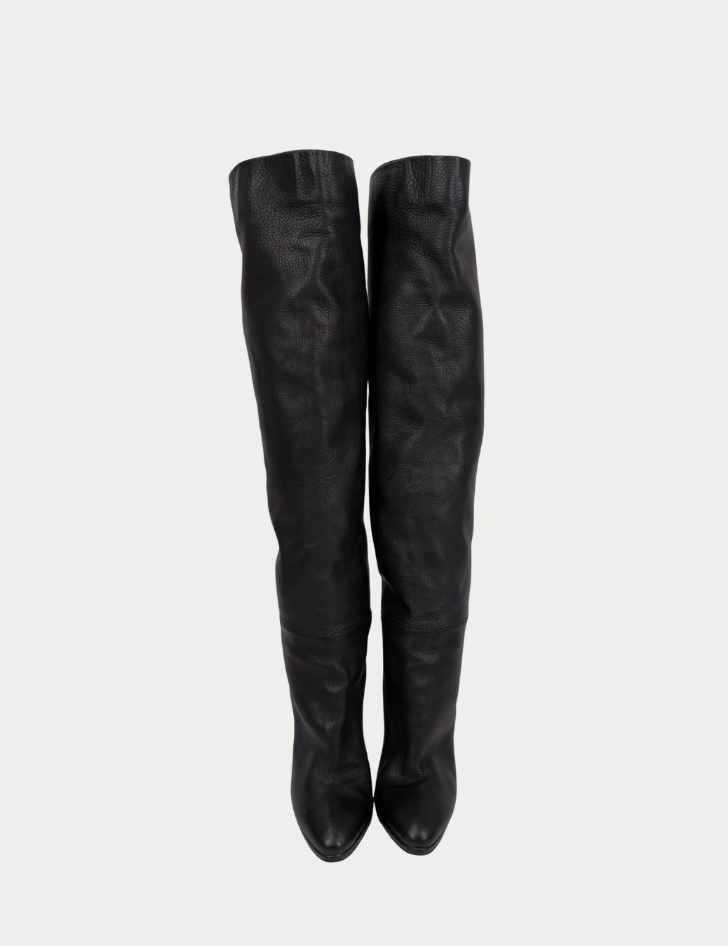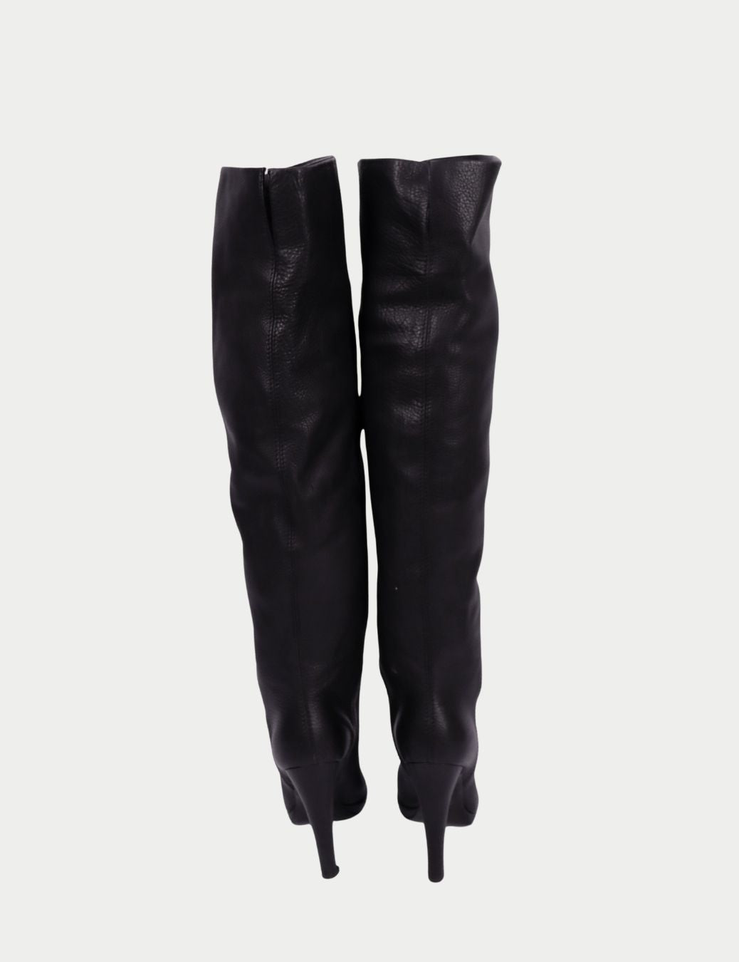 Sleek and commanding, these Giuseppe Zanotti black leather knee-high boots are designed to elongate the silhouette with a refined, body-skimming fit. Crafted from supple grained leather and finished with a slim high heel, they balance elegance with undeniable edge. A timeless statement boot perfect for evening looks, winter styling, or elevating minimalist outfits.
