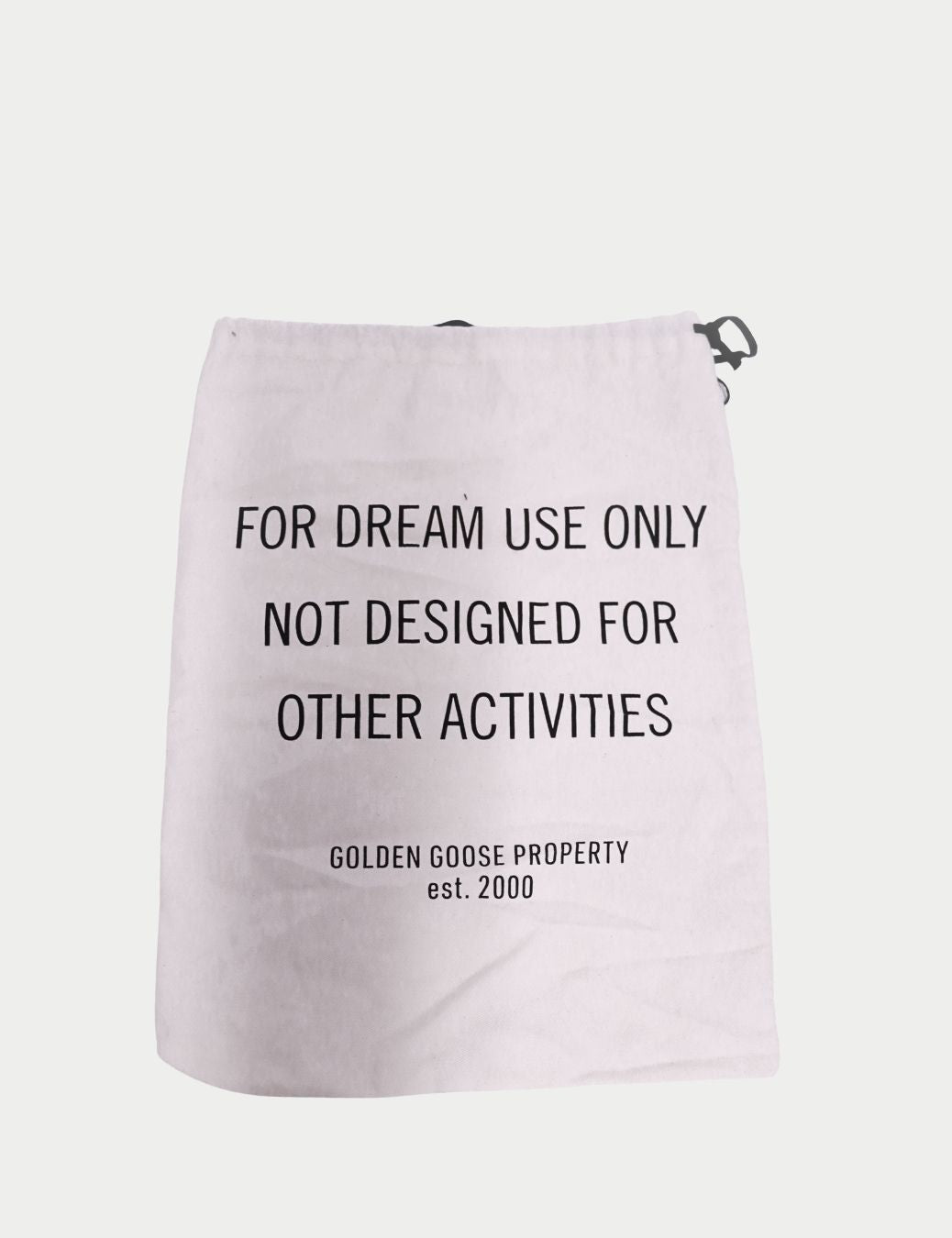 Add a touch of Golden Goose attitude to your storage with this white drawstring dust bag, featuring the iconic printed slogan: “For Dream Use Only”. Perfect for protecting sneakers, shoes, accessories, or small essentials—ideal for travel and keeping items dust-free at home.