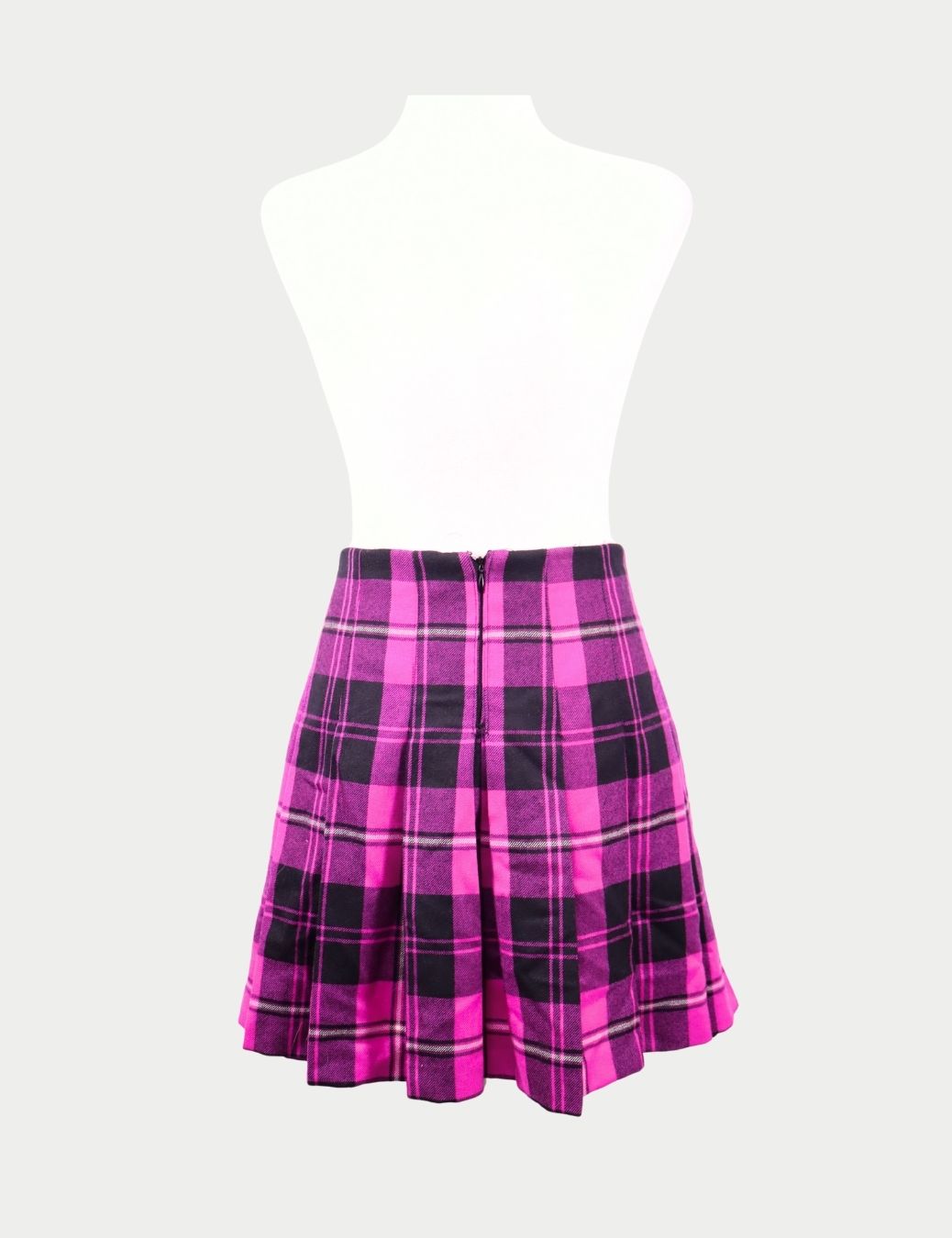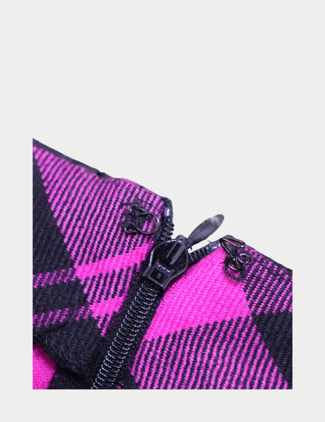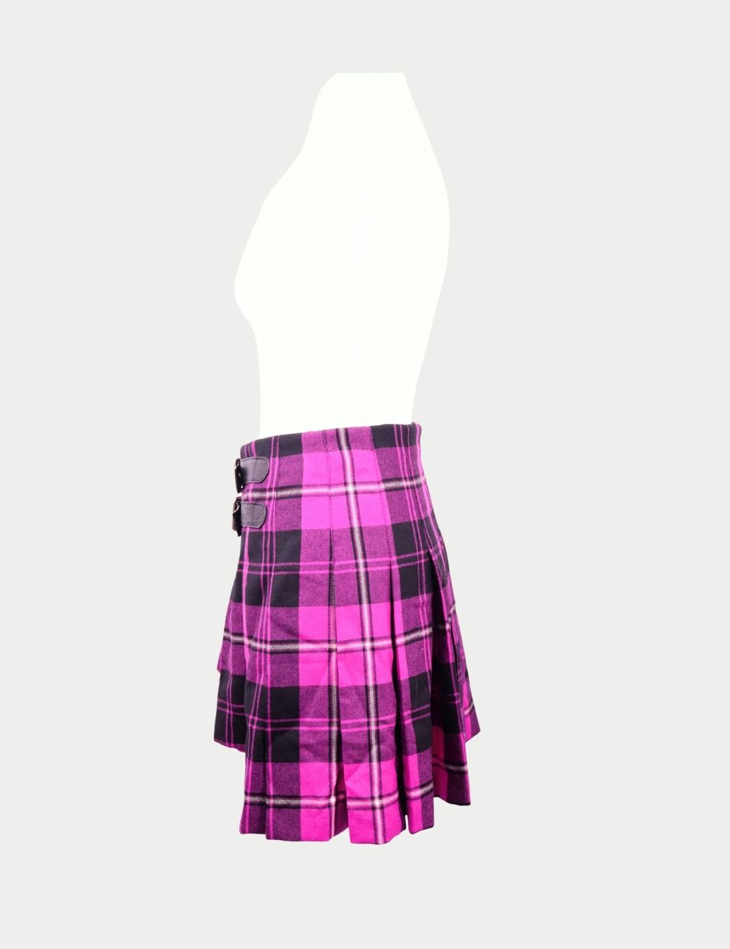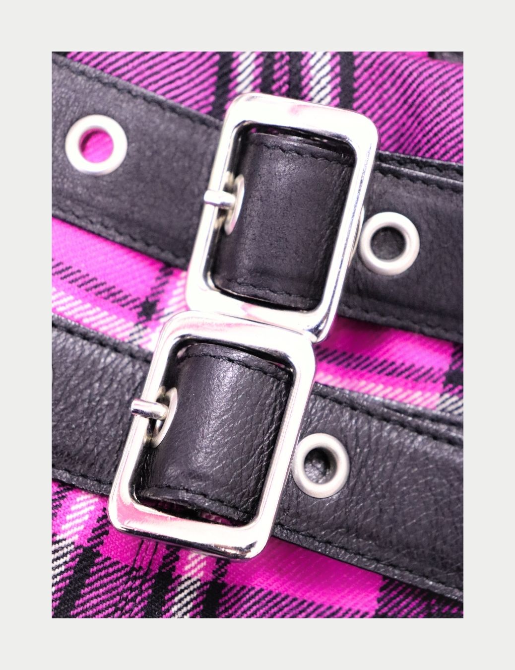 Turn heads with this authentic Dolce & Gabbana plaid mini skirt, crafted in a striking pink and black tartan with sharp pleats and signature double buckle accents at the waist.