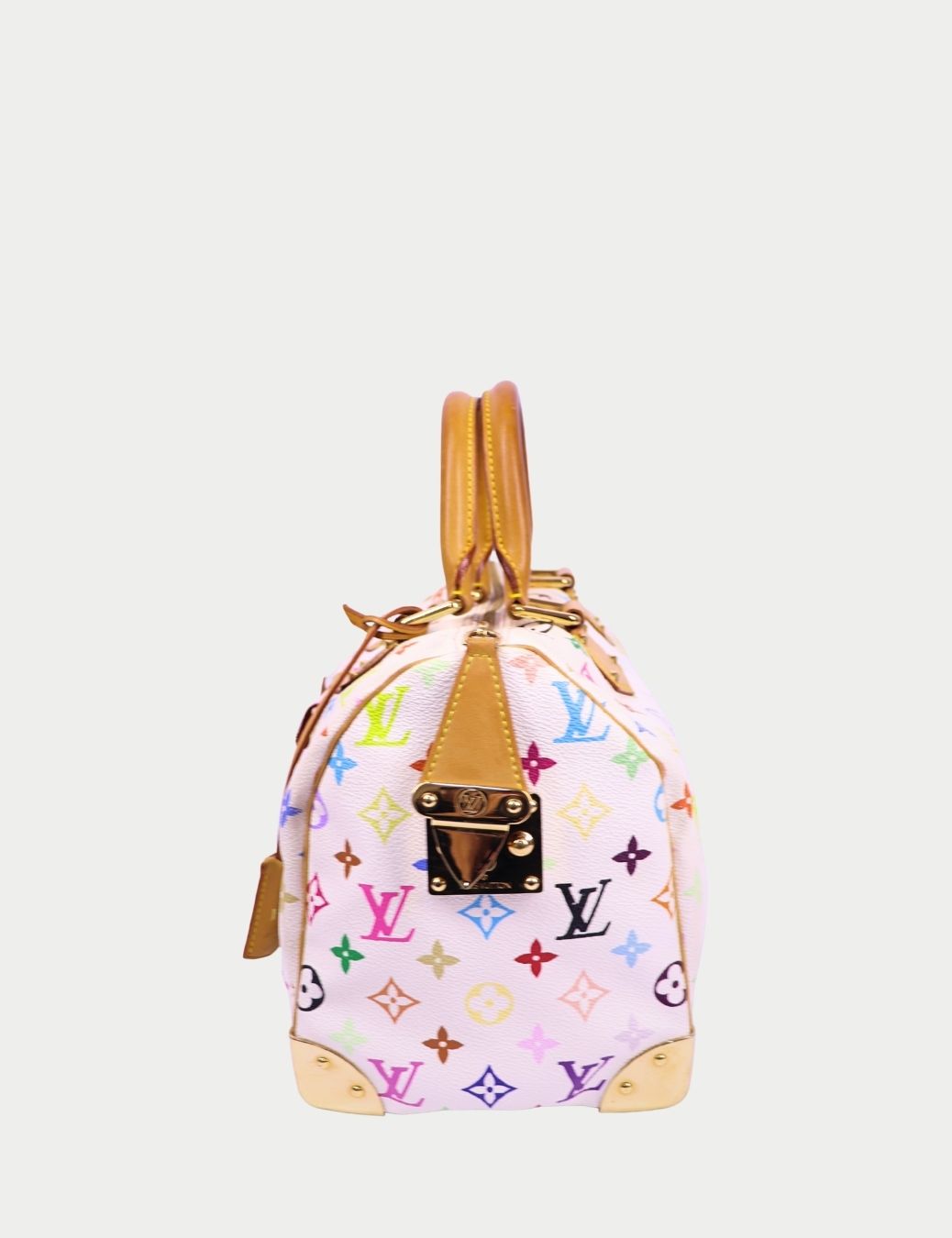 This authentic Louis Vuitton Multicolor Speedy is a true collector’s piece from the brand’s early 2000s era. Designed in collaboration with artist Takashi Murakami, the vibrant multicolor monogram is set against a white coated canvas, creating a bold yet timeless statement.