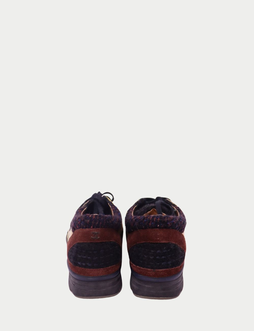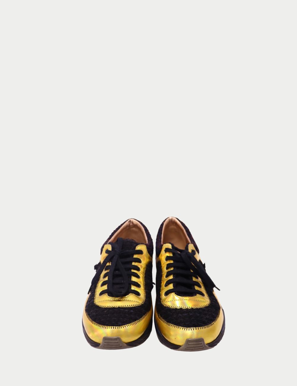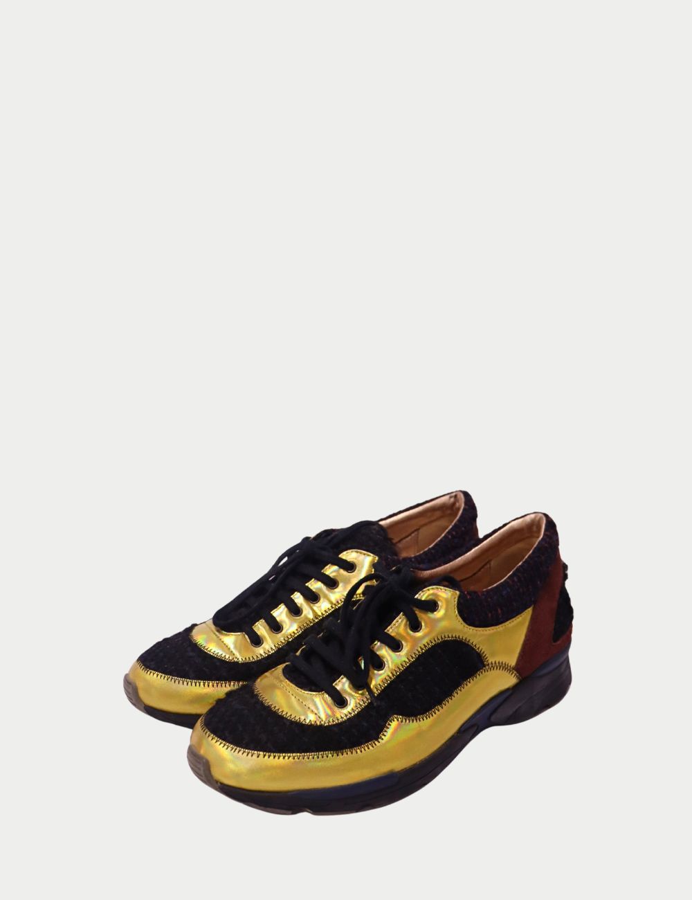 Add a bold twist to casualwear with these Chanel lace-up sneakers, blending luxury craftsmanship with statement style. Featuring metallic gold leather panels, classic black tweed fabric, and brown suede accents, these sneakers embody Chanel’s signature mix of elegance and edge. The comfortable rubber sole makes them perfect for all-day wear, while the unique design ensures they stand out from the crowd.