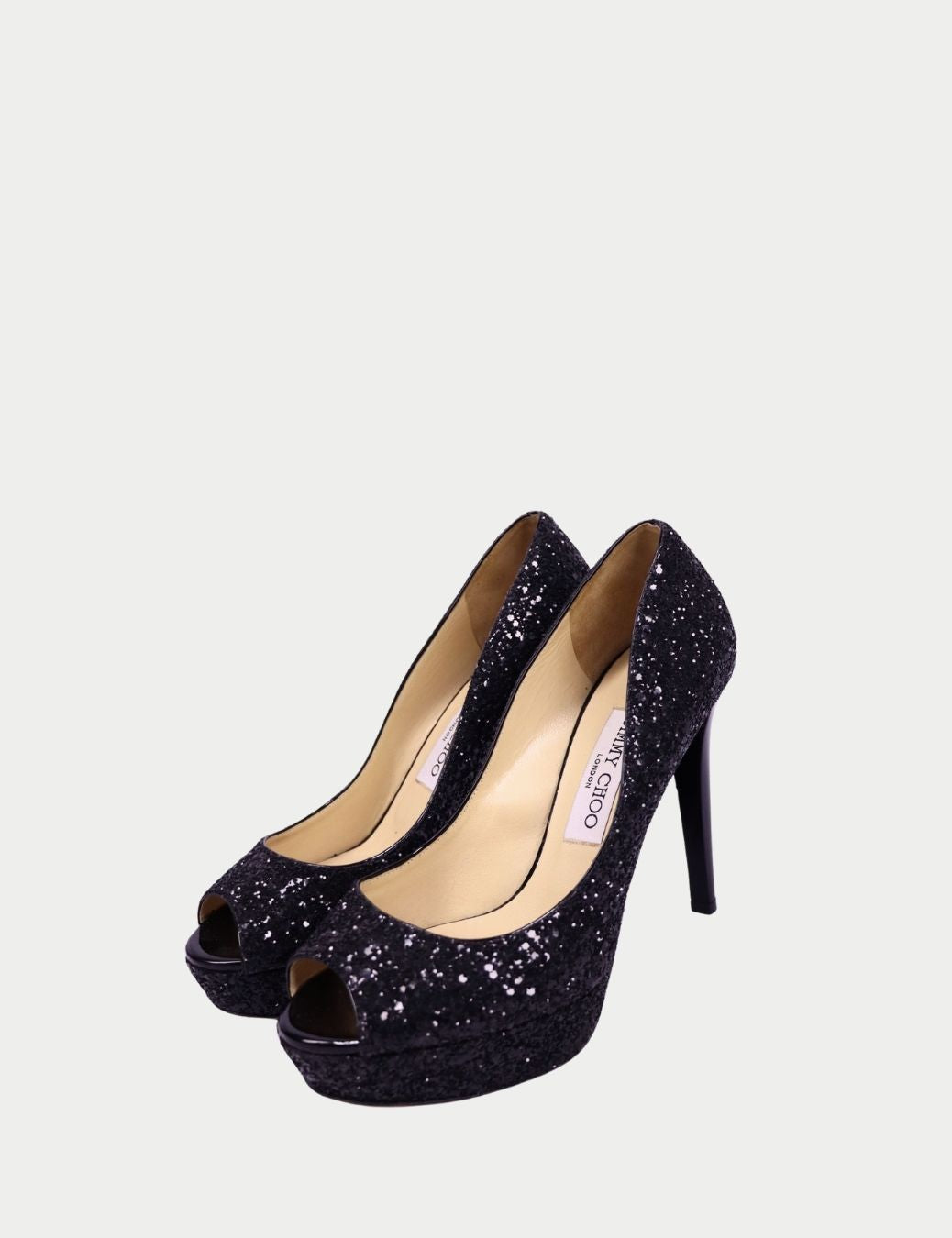 These authentic Jimmy Choo platform pumps are crafted in black glitter fabric, designed to catch the light from every angle. Featuring a peep-toe front, elevated platform, and sleek stiletto heel, they combine glamour with a leg-lengthening silhouette.