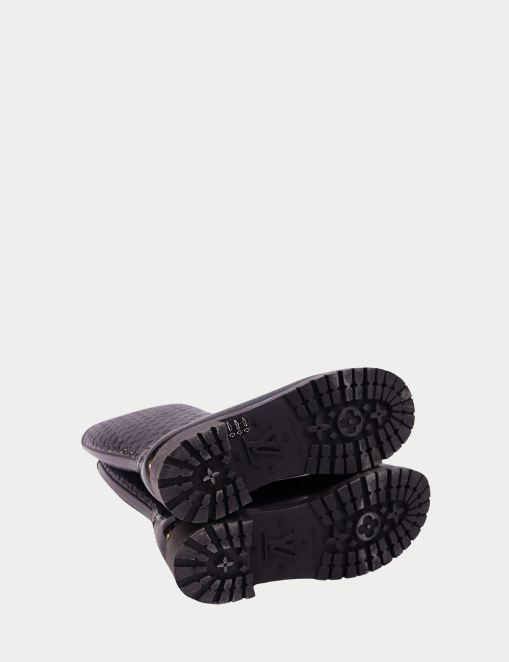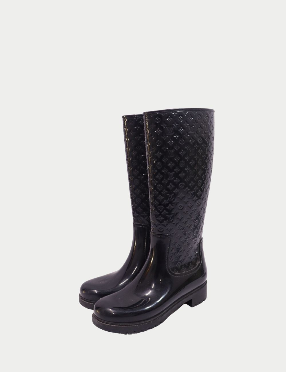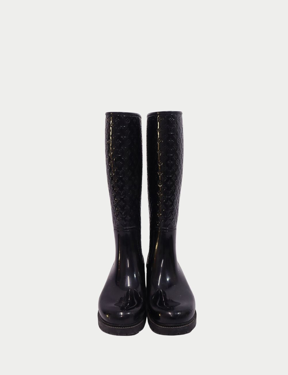 Step into luxury even on rainy days with these Louis Vuitton Black Monogram Rain Boots. Crafted from high-quality rubber, these boots feature an all-over embossed LV monogram pattern, making them instantly recognizable as a signature Louis Vuitton piece.