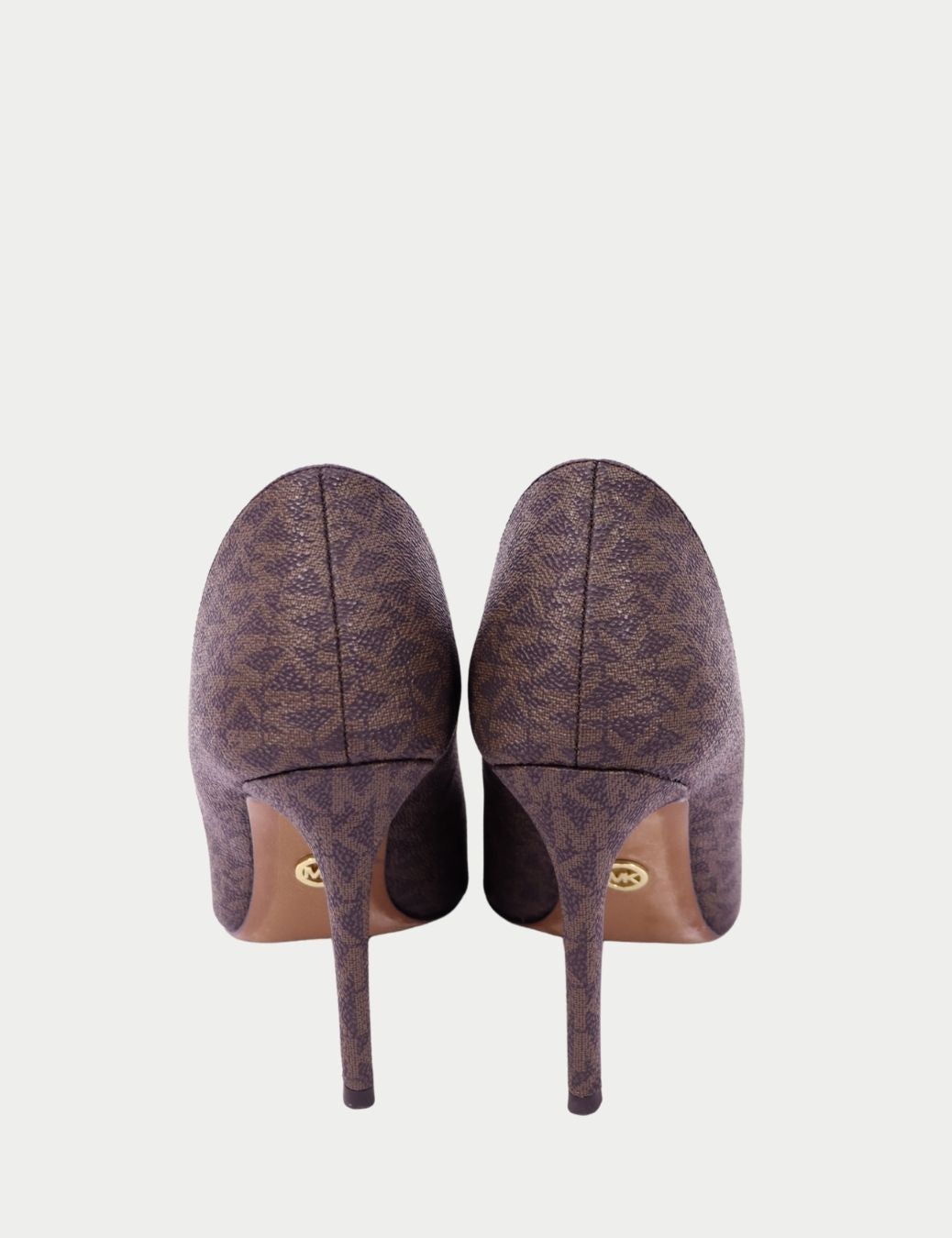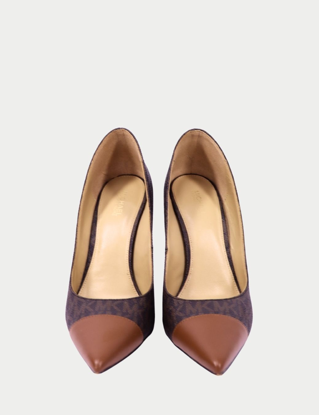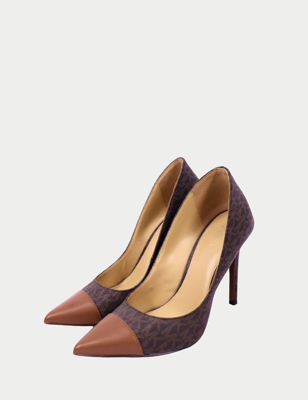 Michael Kors Monogram Pointed-Toe Pumps with Brown Leather Cap