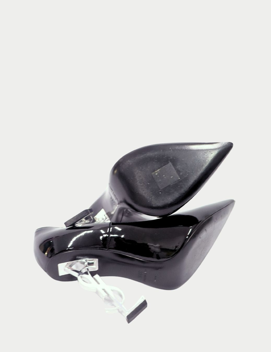 Make a bold statement with these Saint Laurent black patent leather pumps, featuring the iconic interlocking YSL logo heel in polished silver-tone metal.