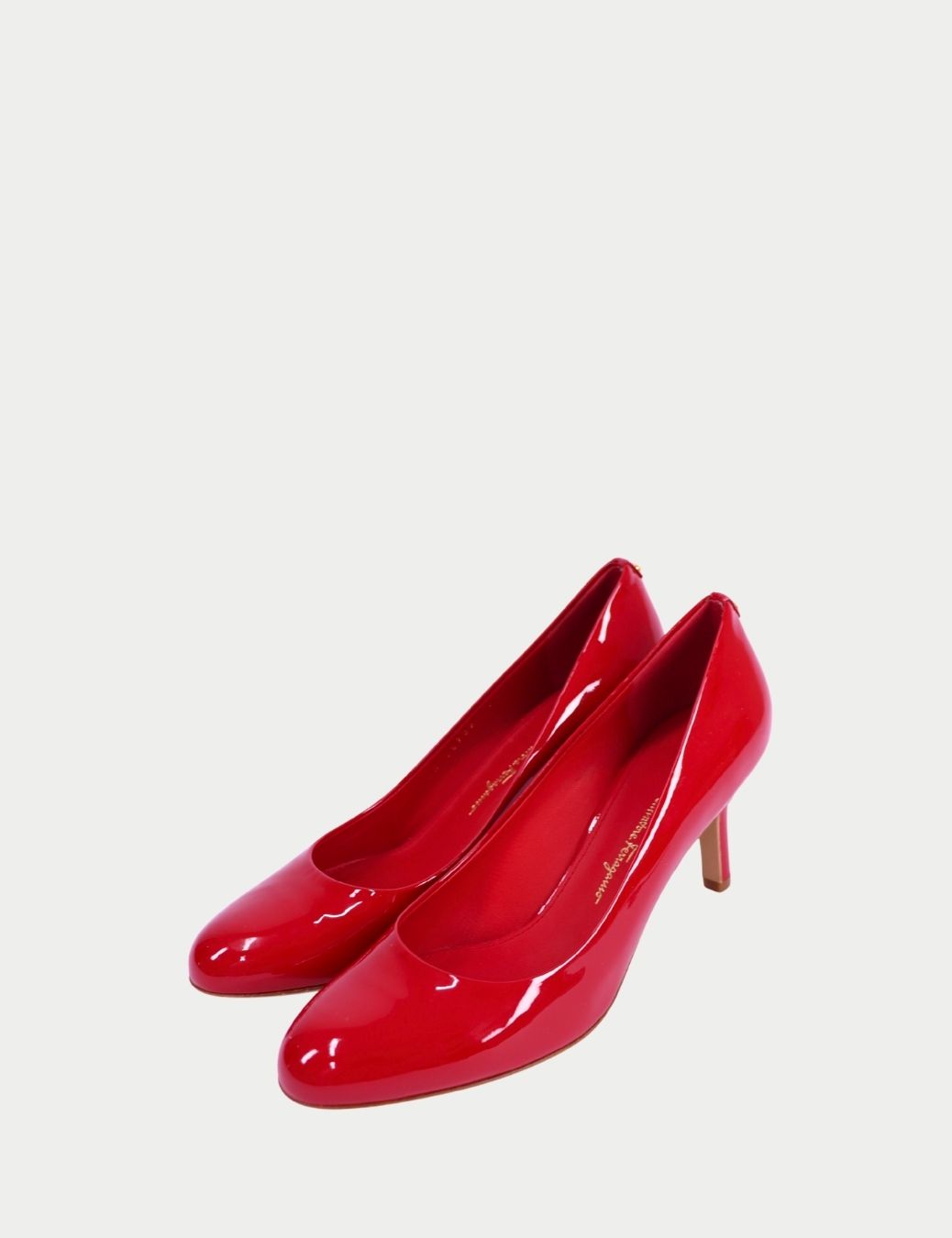 Add a bold pop of color to your wardrobe with these timeless Salvatore Ferragamo red patent leather pumps. Designed with a sleek rounded toe and comfortable mid heel, this classic silhouette transitions effortlessly from workdays to evenings out.