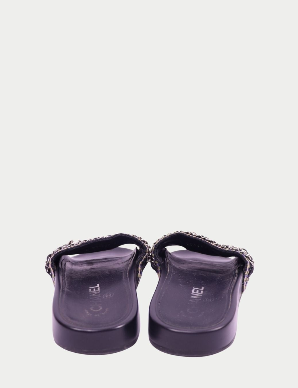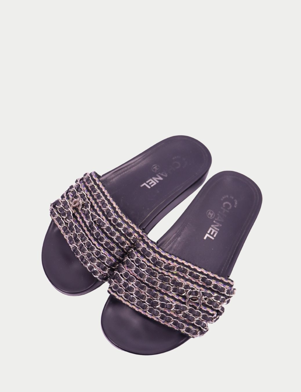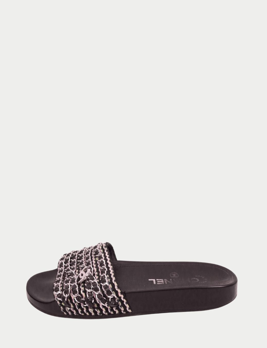 These Chanel black tweed slide sandals blend comfort with iconic house detailing. The wide strap features classic Chanel-inspired tweed interwoven with silver-tone chain accents, finished with a subtle CC logo detail for that unmistakable luxury touch.