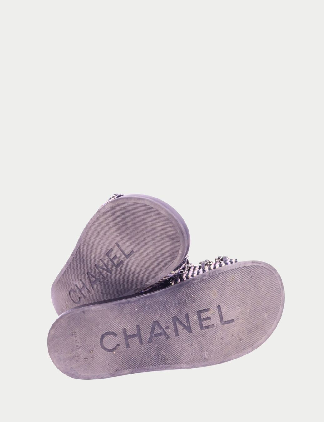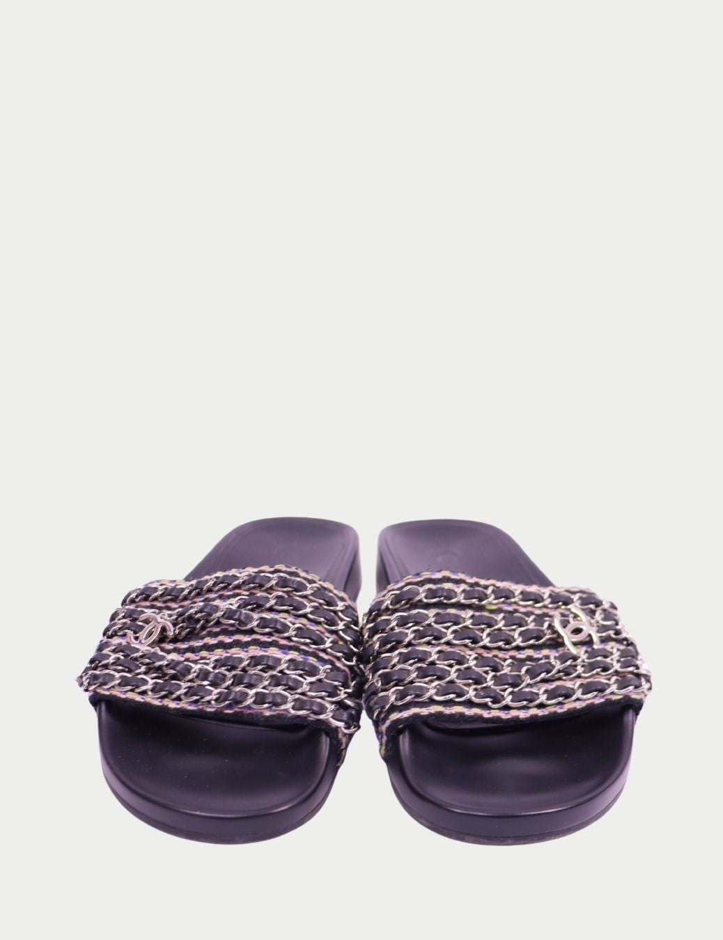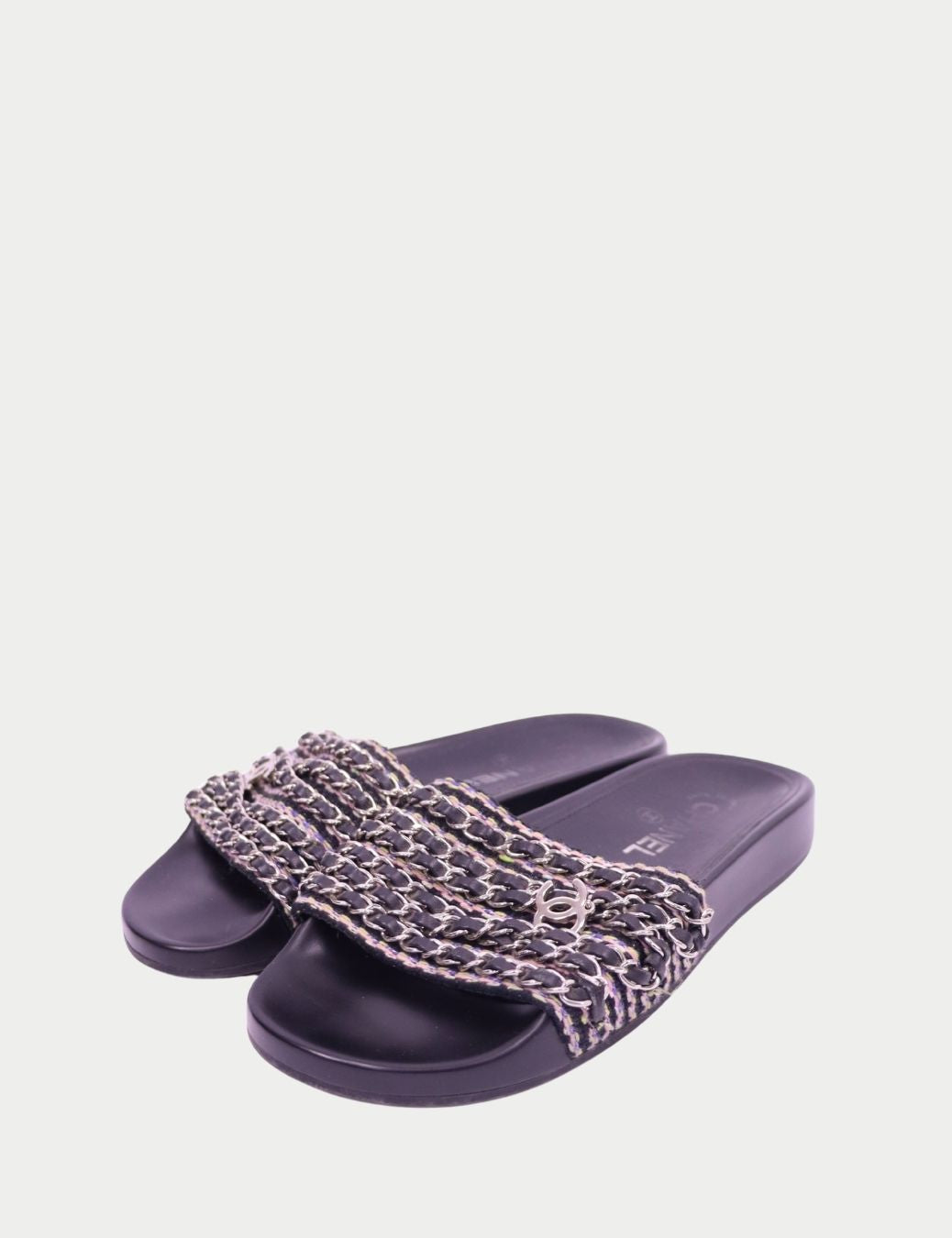 These Chanel black tweed slide sandals blend comfort with iconic house detailing. The wide strap features classic Chanel-inspired tweed interwoven with silver-tone chain accents, finished with a subtle CC logo detail for that unmistakable luxury touch.