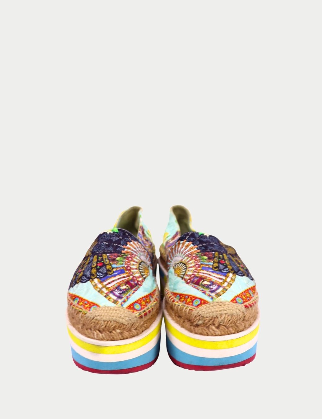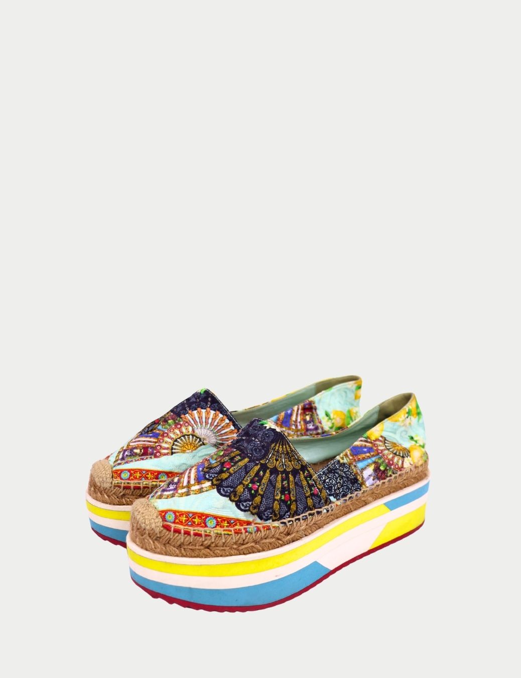 These authentic Dolce & Gabbana espadrille sneakers are designed for maximum impact. Featuring a richly printed fabric upper inspired by Mediterranean motifs, the shoe is set on a statement platform sole with braided jute detailing and colorful rubber accents.