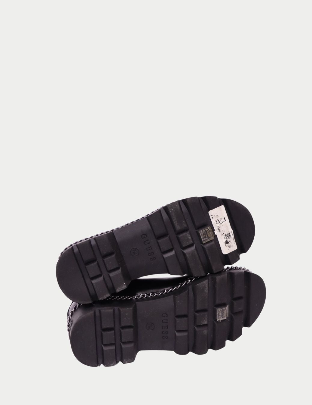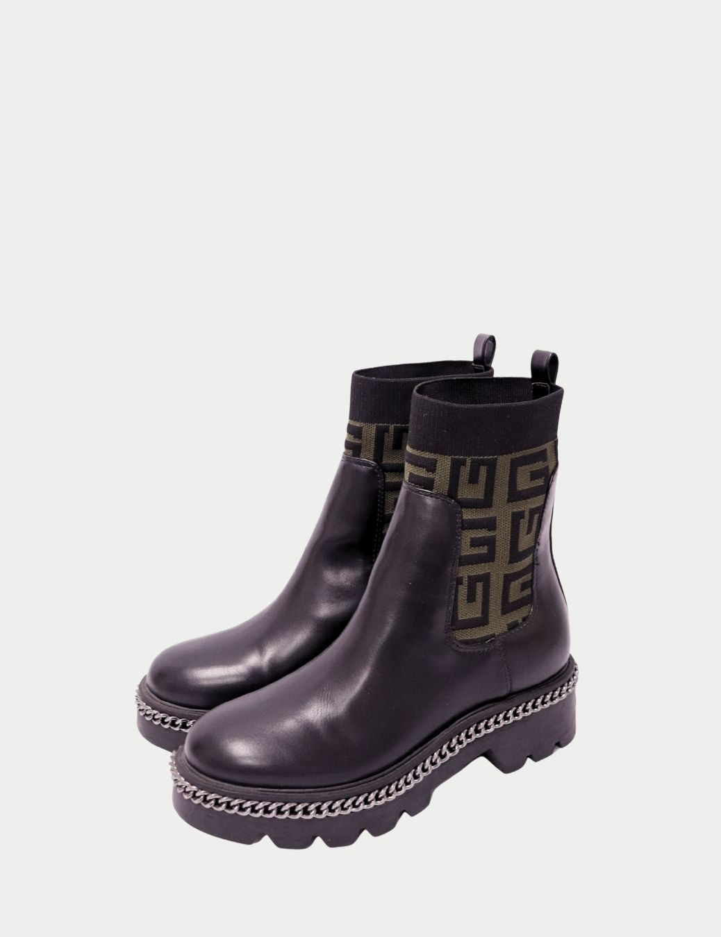 Guess Black Leather Ankle Boots with Chain Trim and Logo Knit Detail