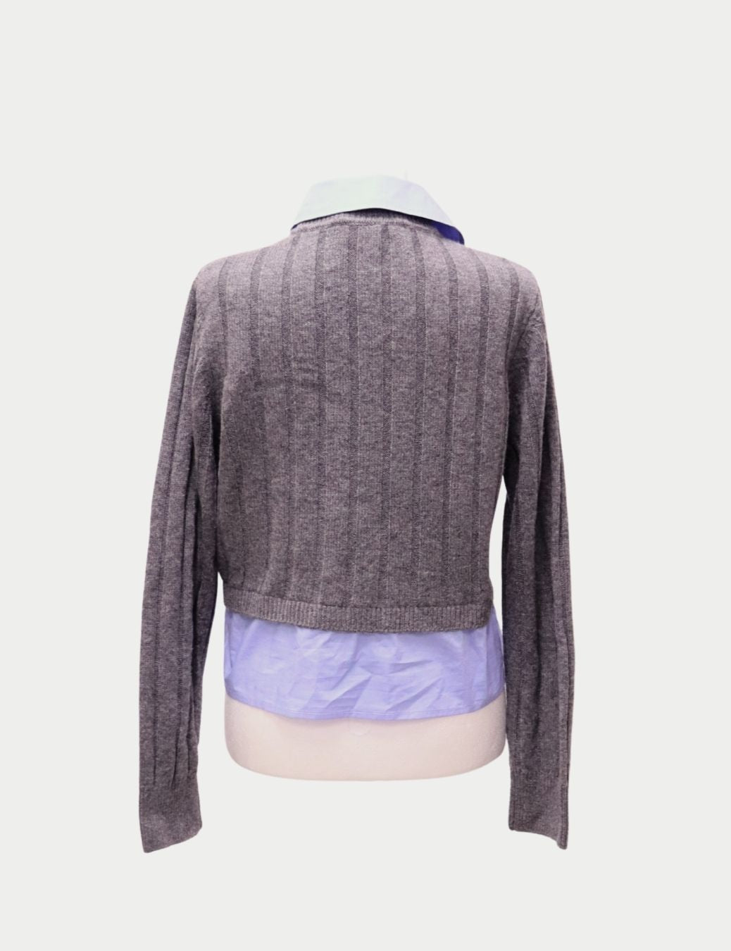 Add a playful twist to your winter wardrobe with this Sandro Paris grey ribbed sweater, designed with signature Parisian flair. Crafted from a soft wool blend, it features a unique layered effect — a faux blue shirt collar and hem paired with contrast denim pockets accented by gold buttons.
