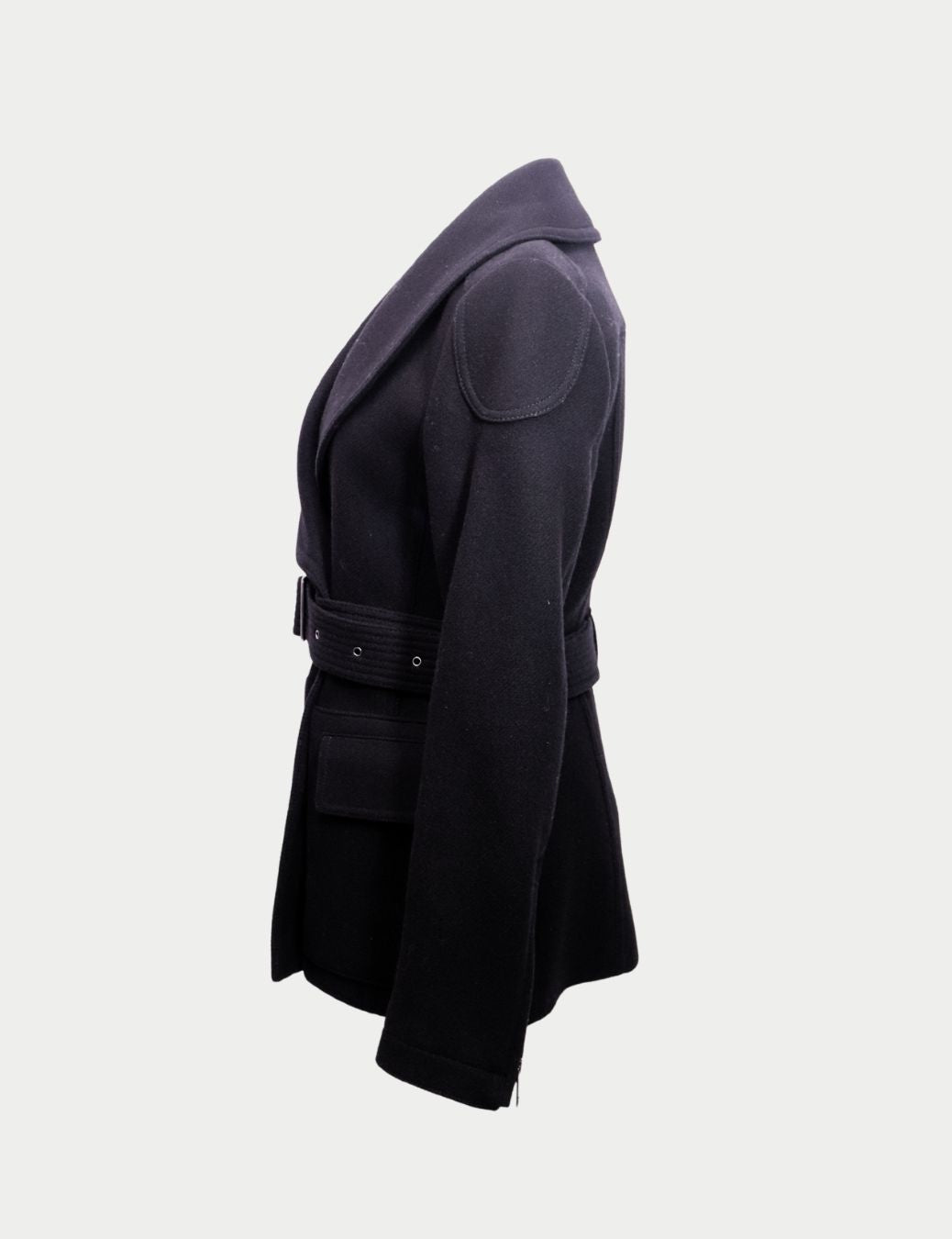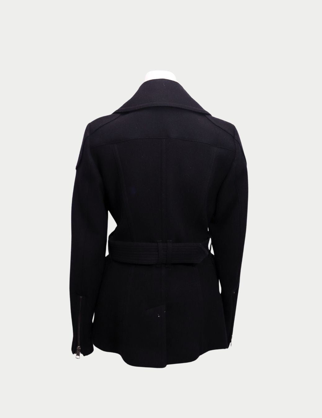 Stay timelessly elegant in this Burberry Brit black wool coat, designed with the house’s signature British tailoring. Crafted from a luxurious wool blend, it features a double-breasted front, wide shawl lapels, and structured shoulders for a refined silhouette. The coat is lined with Burberry’s iconic heritage check pattern, adding a distinctive touch of sophistication. Finished with front flap pockets and a detachable waist belt, it combines practicality with style. Perfect for layering over workwear, evening outfits, or casual winter looks, this Burberry Brit coat is an investment piece for enduring elegance.