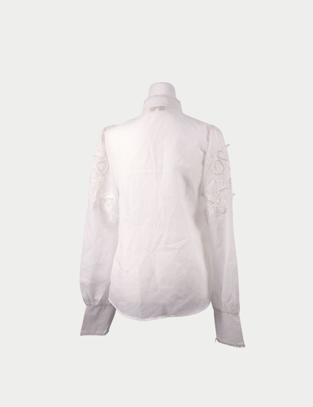 Ethereal and refined, this Zimmermann white embellished blouse showcases the brand’s signature romantic aesthetic. Crafted from a lightweight sheer fabric, it features intricate embroidery accented with pearl-style details and a polished high neckline. Perfect for elegant daytime looks, special occasions, or elevated layering, this blouse embodies effortless femininity and timeless design.