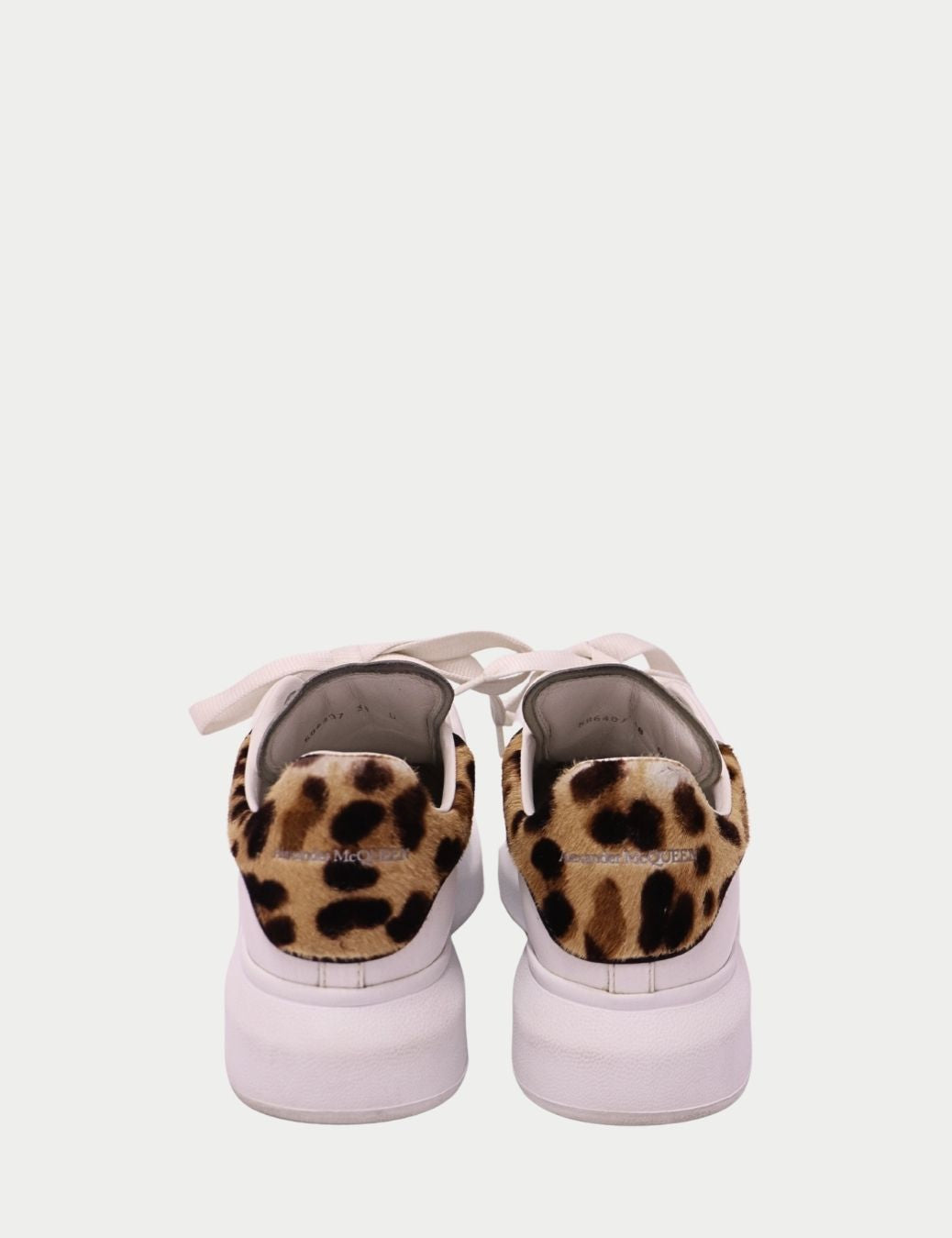 Level up your everyday looks with these authentic Alexander McQueen Oversized Sneakers, featuring a clean white leather body and the brand’s signature chunky sole. This pair stands out with a leopard-print heel tab, adding a touch of personality and edge to the minimalist silhouette.