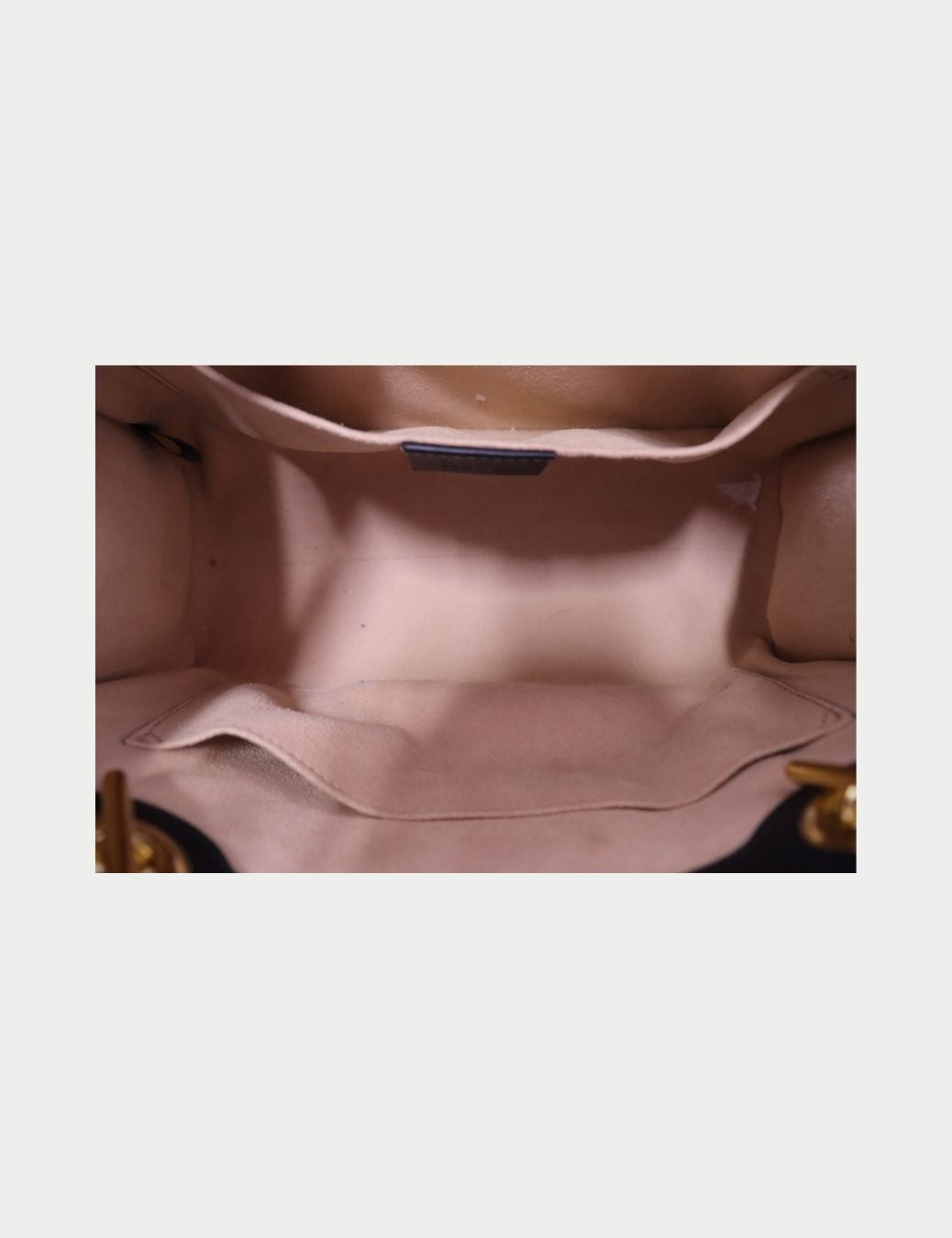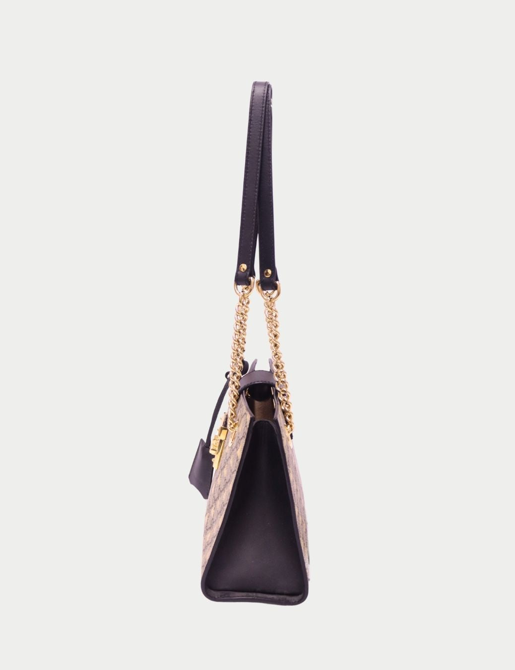 The structured design is complemented by black leather trim, a gold-tone padlock clasp, and dual chain-and-leather shoulder straps for a versatile carry. Whether styled as a chic day bag or a statement evening piece, this bag exudes elegance and sophistication.
