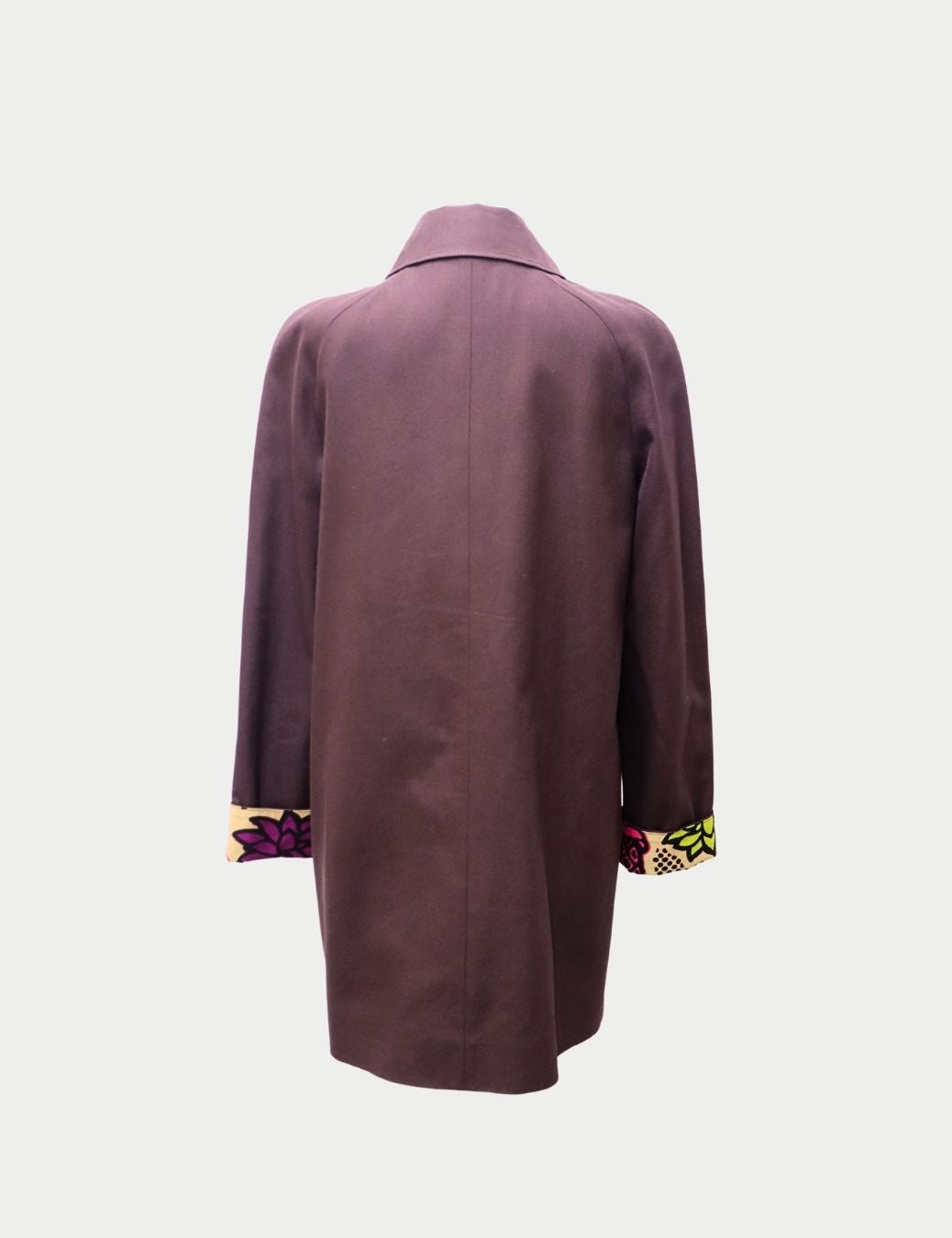Crafted from a smooth brown fabric with a soft satin lining, the coat features vibrant patterned pocket flaps and cuffs — adding a bold pop of color and personality to its classic silhouette. The design is finished with button closures and a collared neckline, creating a sophisticated yet whimsical outerwear statement that embodies Moschino’s unique DNA.